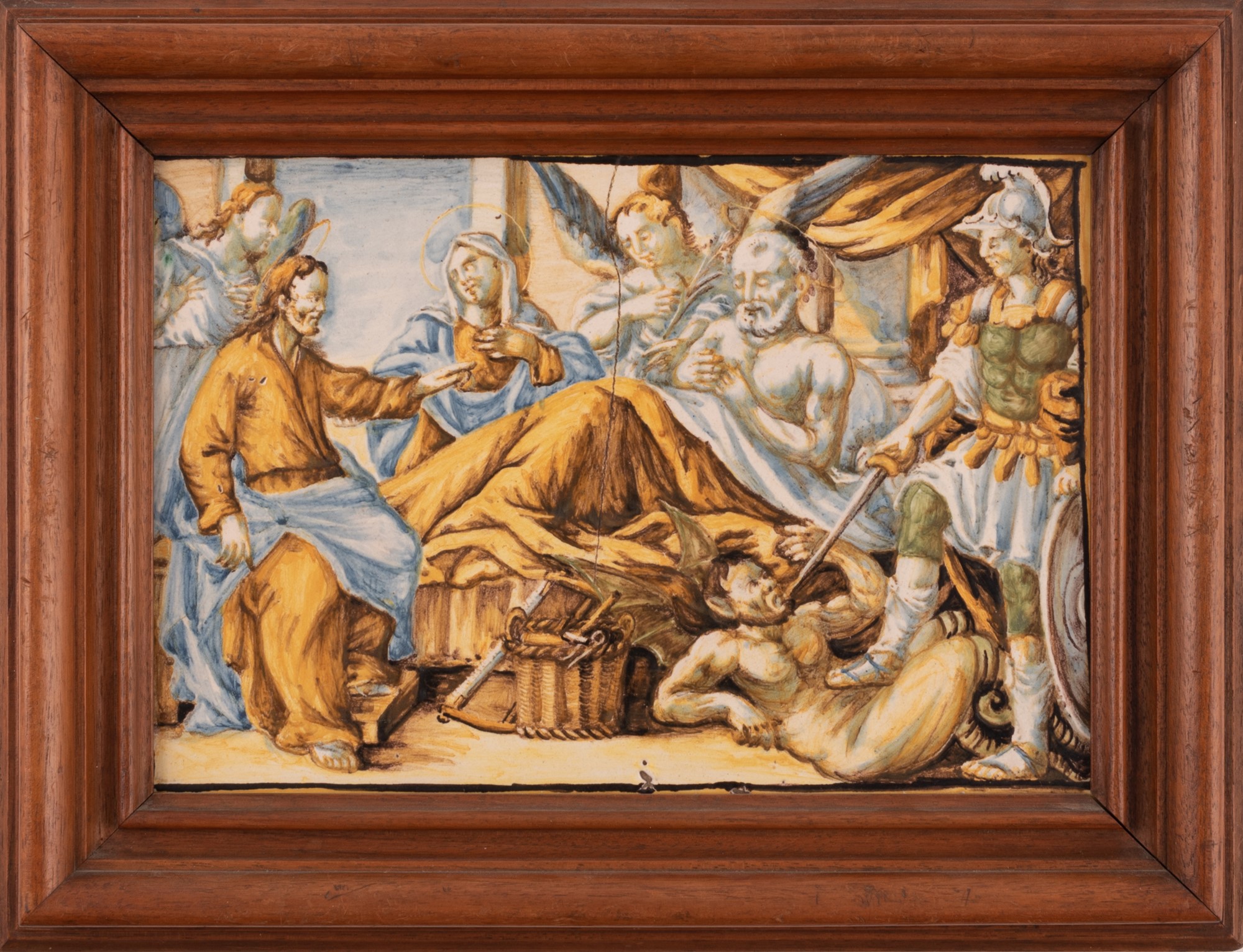 Mattonella maiolicata raffigurante l'episodio biblico della Resurrezione di Lazzaro.