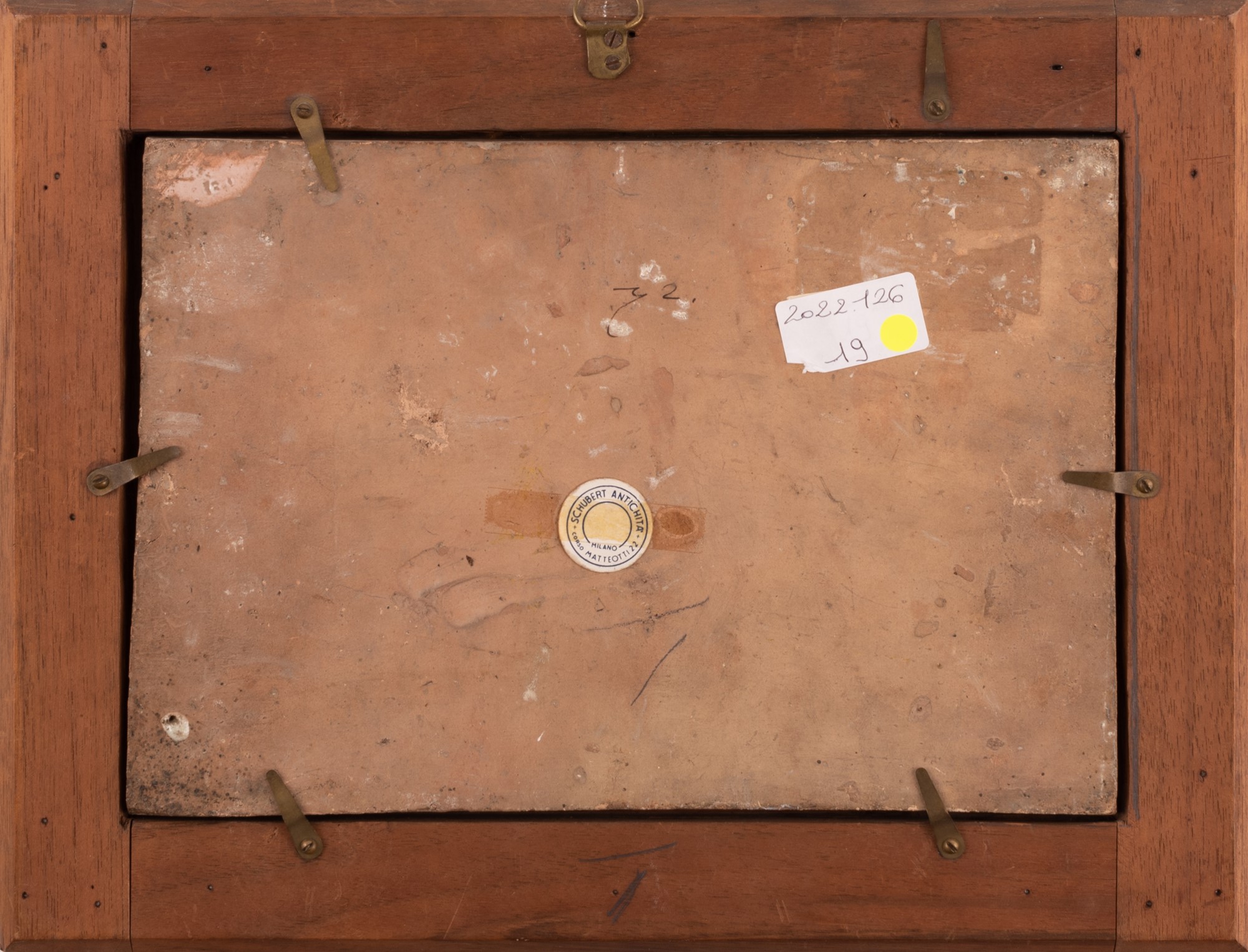 Maestro castellano attivo intorno alla metà del XVIII secolo ( - ) Mattonella maiolicata raffigurante l'episodio biblico della Resurrezione di Lazzaro. cm 18x26