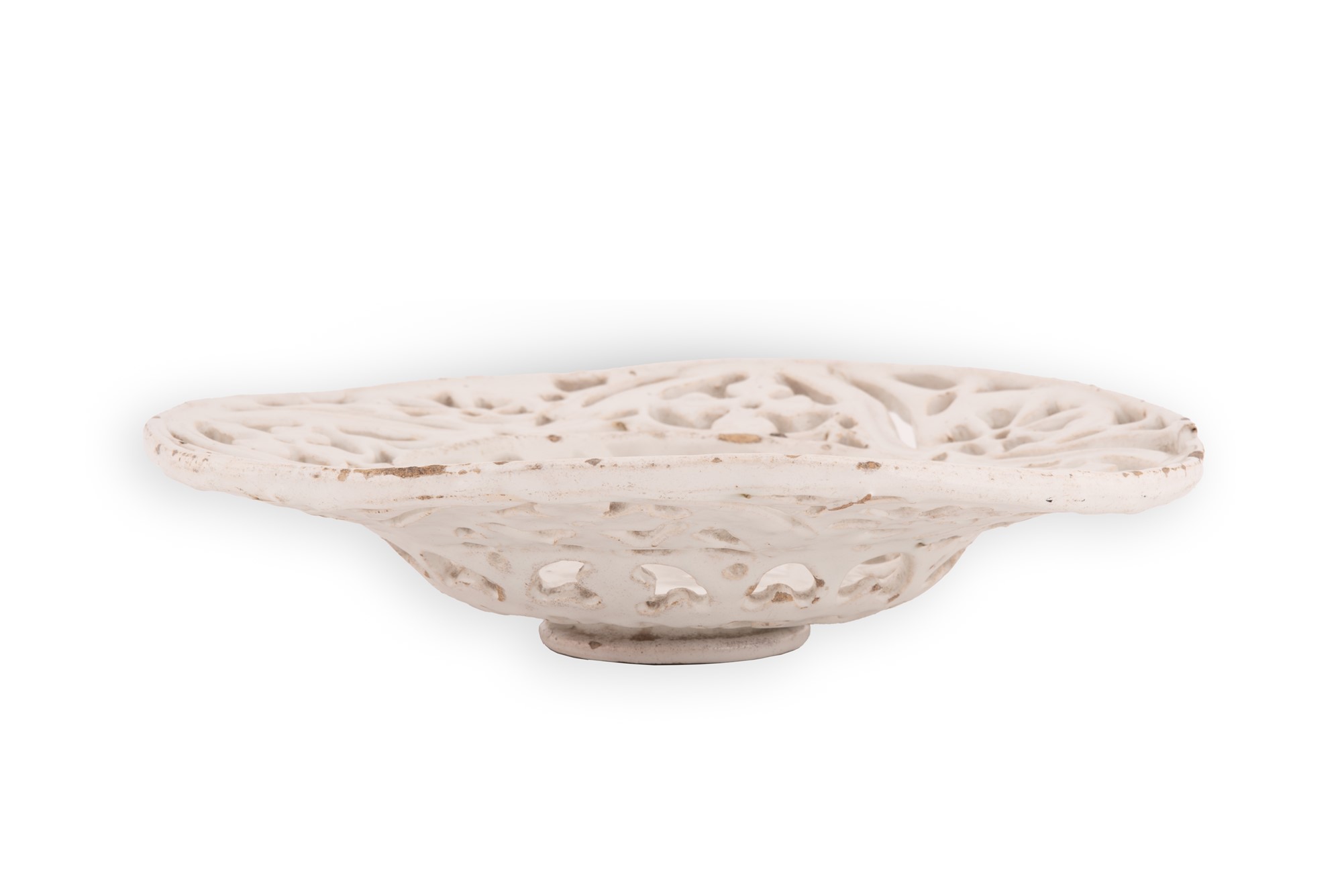 Crespina in maiolica a fondo bianco e traforata a formare motivo geometrico.