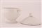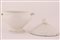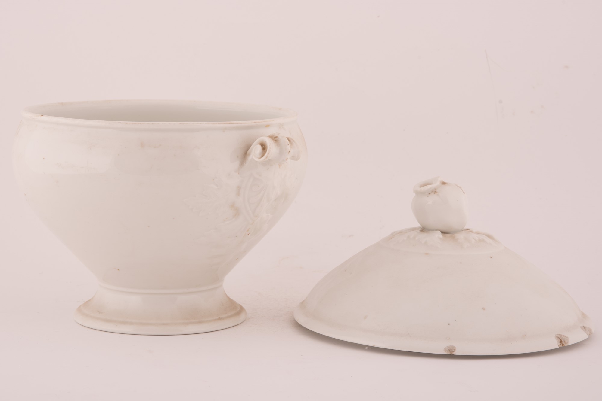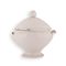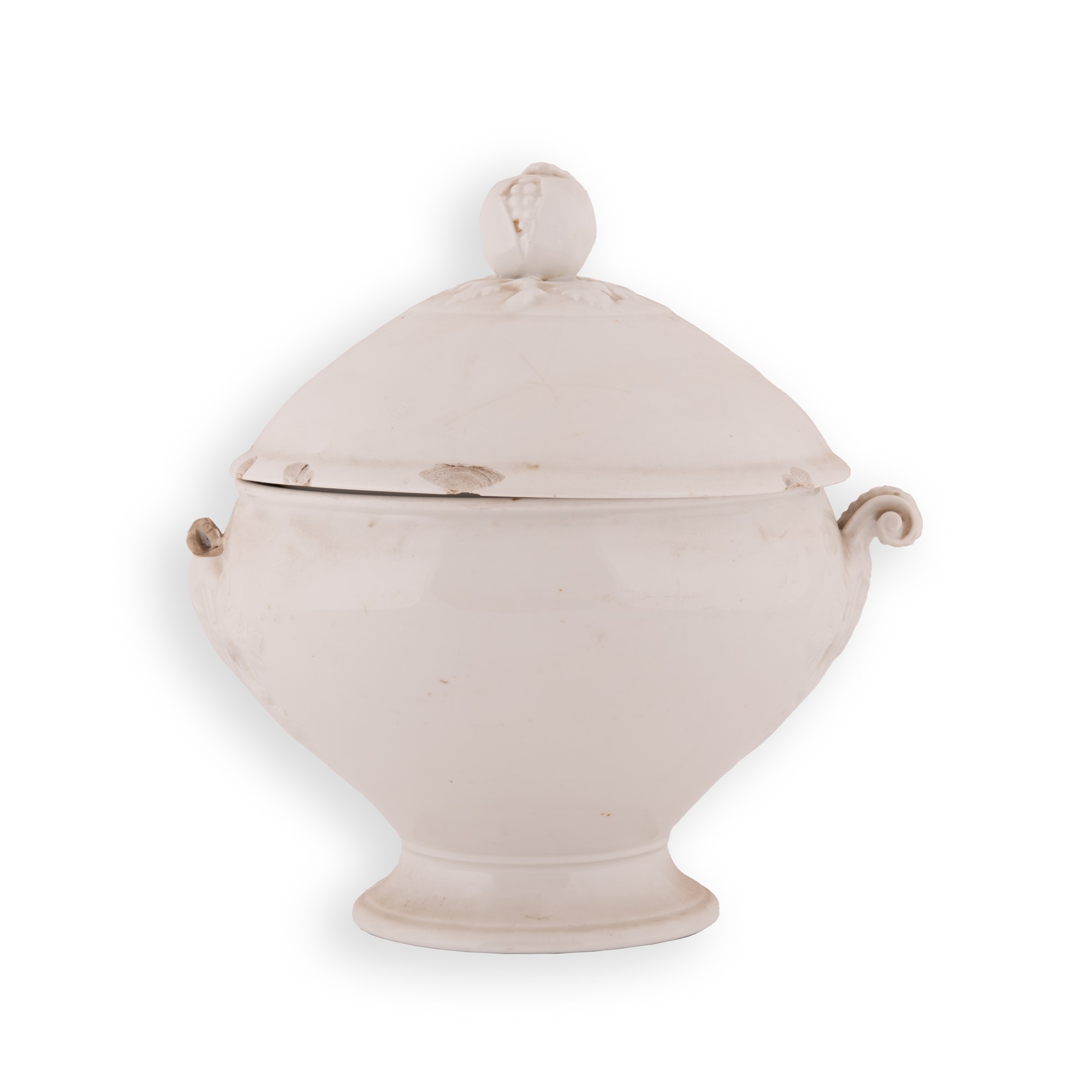 Zuppiera in maiolica decorata con elementi naturalistici (fiore e frutto) a rilievo.