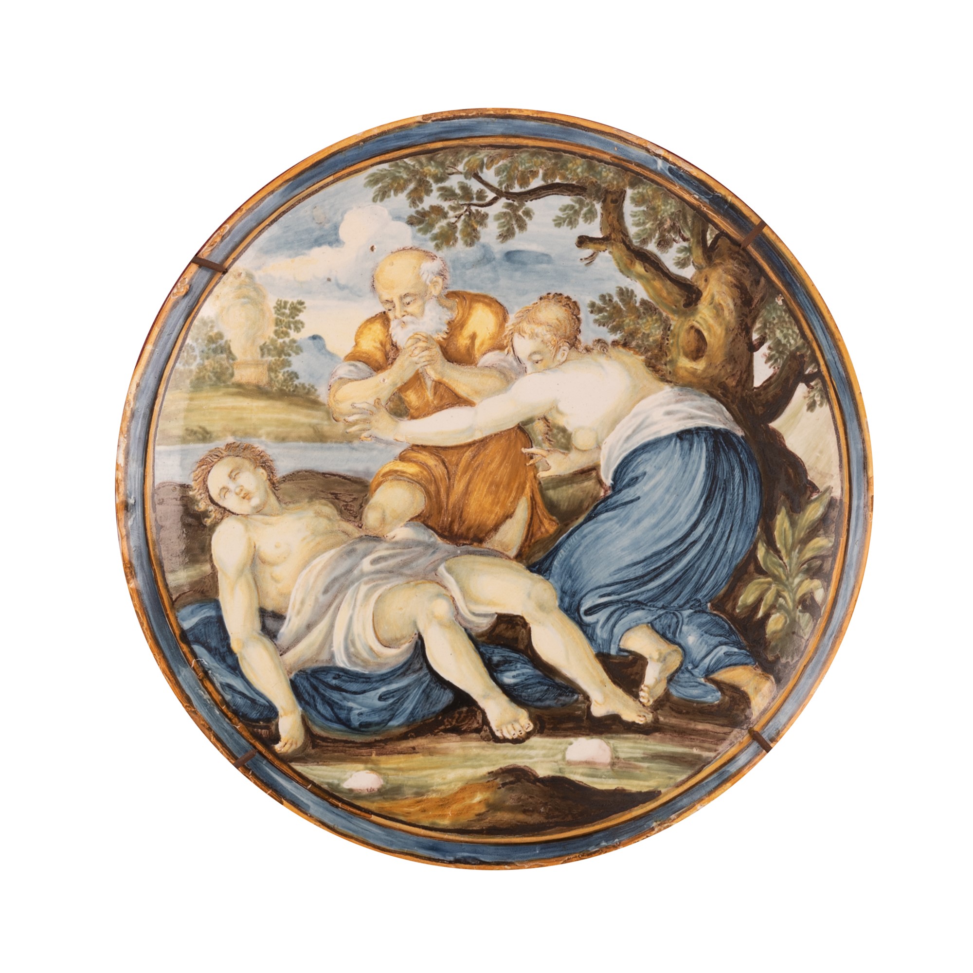 Tondo in maiolica decorato con una scena mitologica.