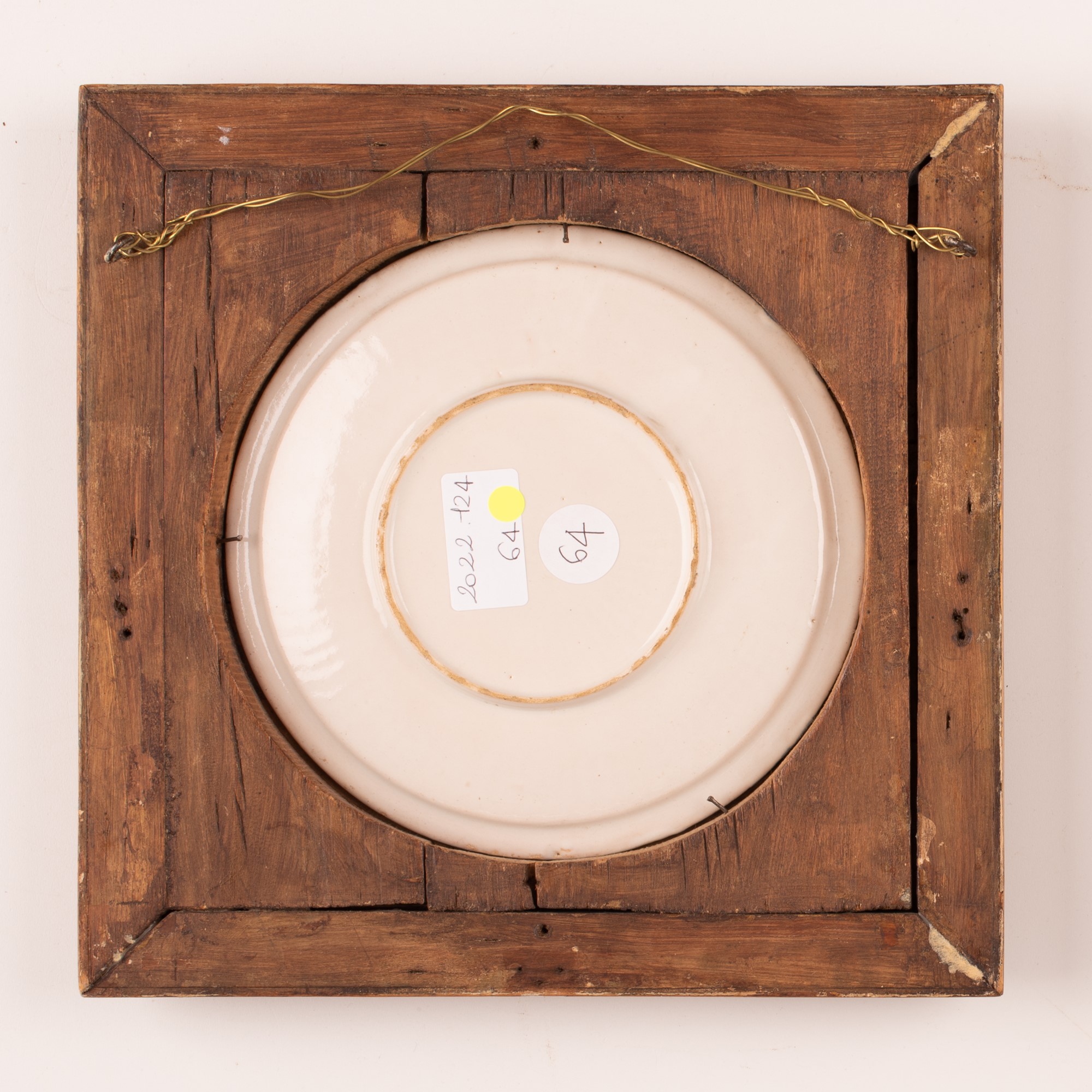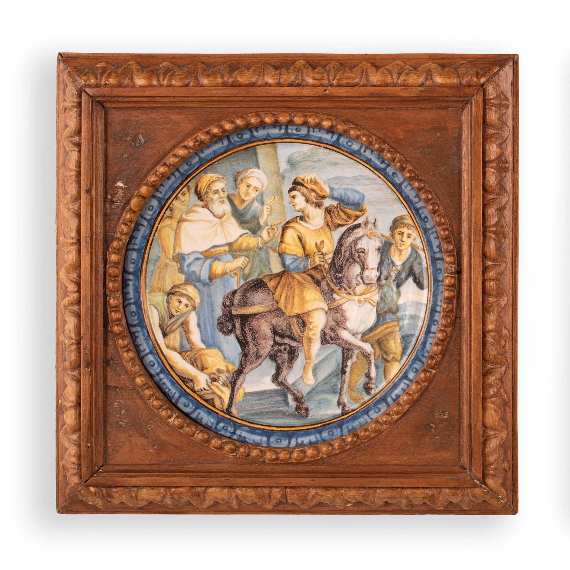 Manifattura Gentili, Castelli, metà del XVIII secolo ( - ) Tondo in maiolica decorata in policromia con la rappresentazione della parabola della partenza del figliol prodigo in cornice lignea scolpita Ø cm 18; con cornice cm 25x25