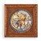 Tondo in maiolica decorata in policromia con la rappresentazione della parabola della partenza del figliol prodigo in cornice lignea scolpita