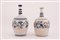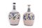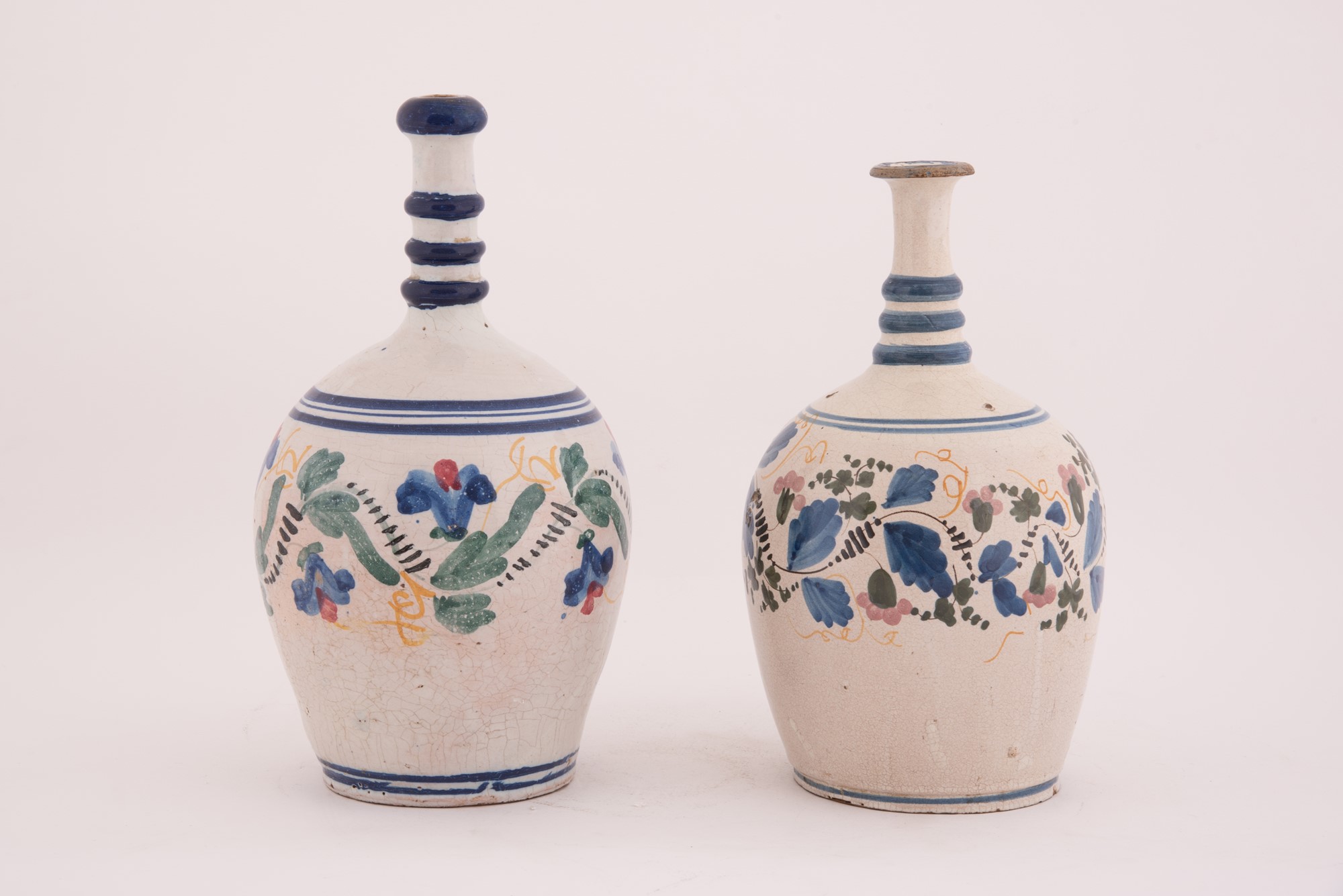 Due bottiglie in maiolica a fondo bianco. Corpo ovoidale decorato i policromia con motivi floreali. Sul collo anelli a rilievo in blu.