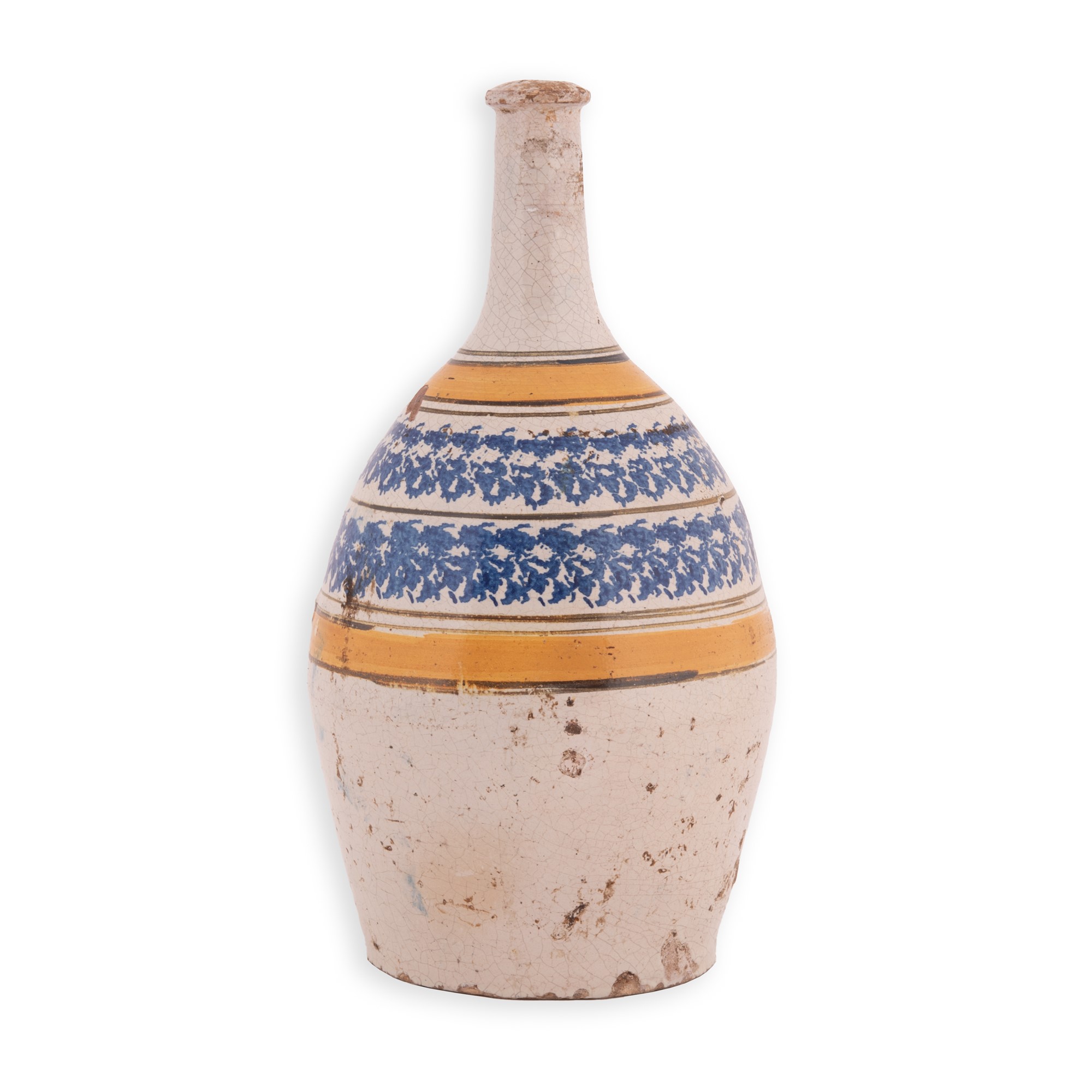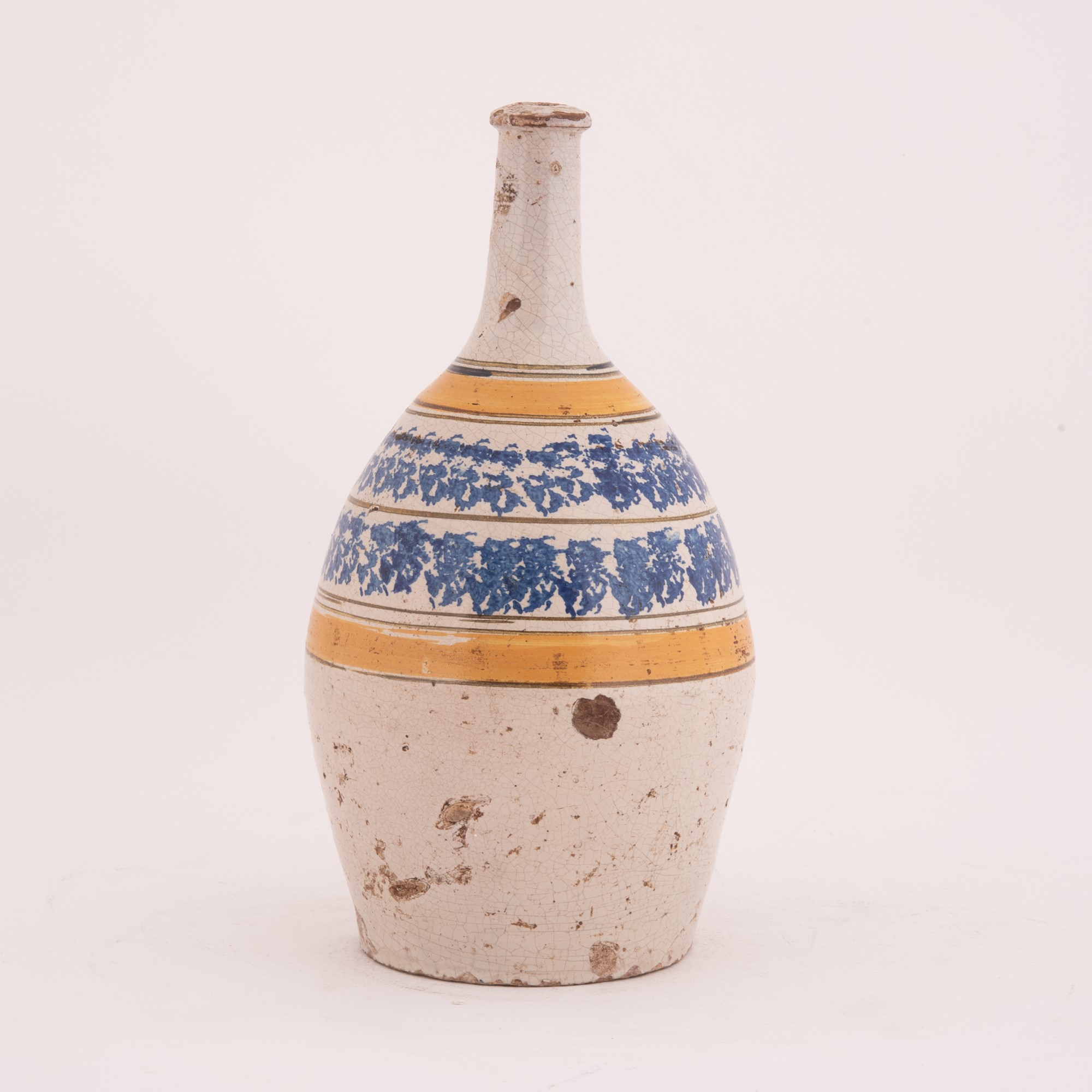 Manifattura di Bussi sul Tirino del XIX secolo ( - ) Bottiglia in maiolica a fondo bianco. Corpo ovoidale decorato con fasce gialle e motivo vegetale in blu realizzato in spugnetta altezza cm 30