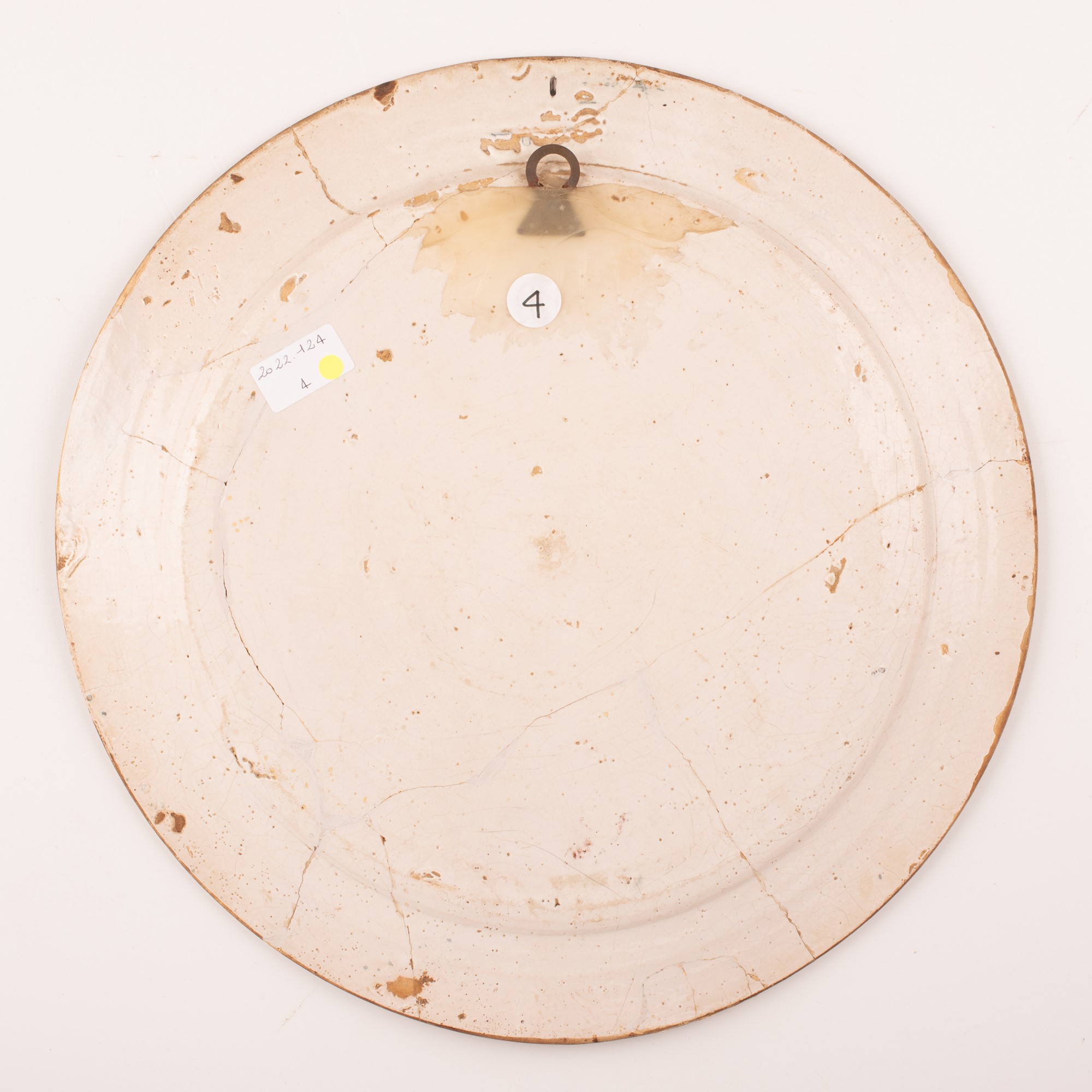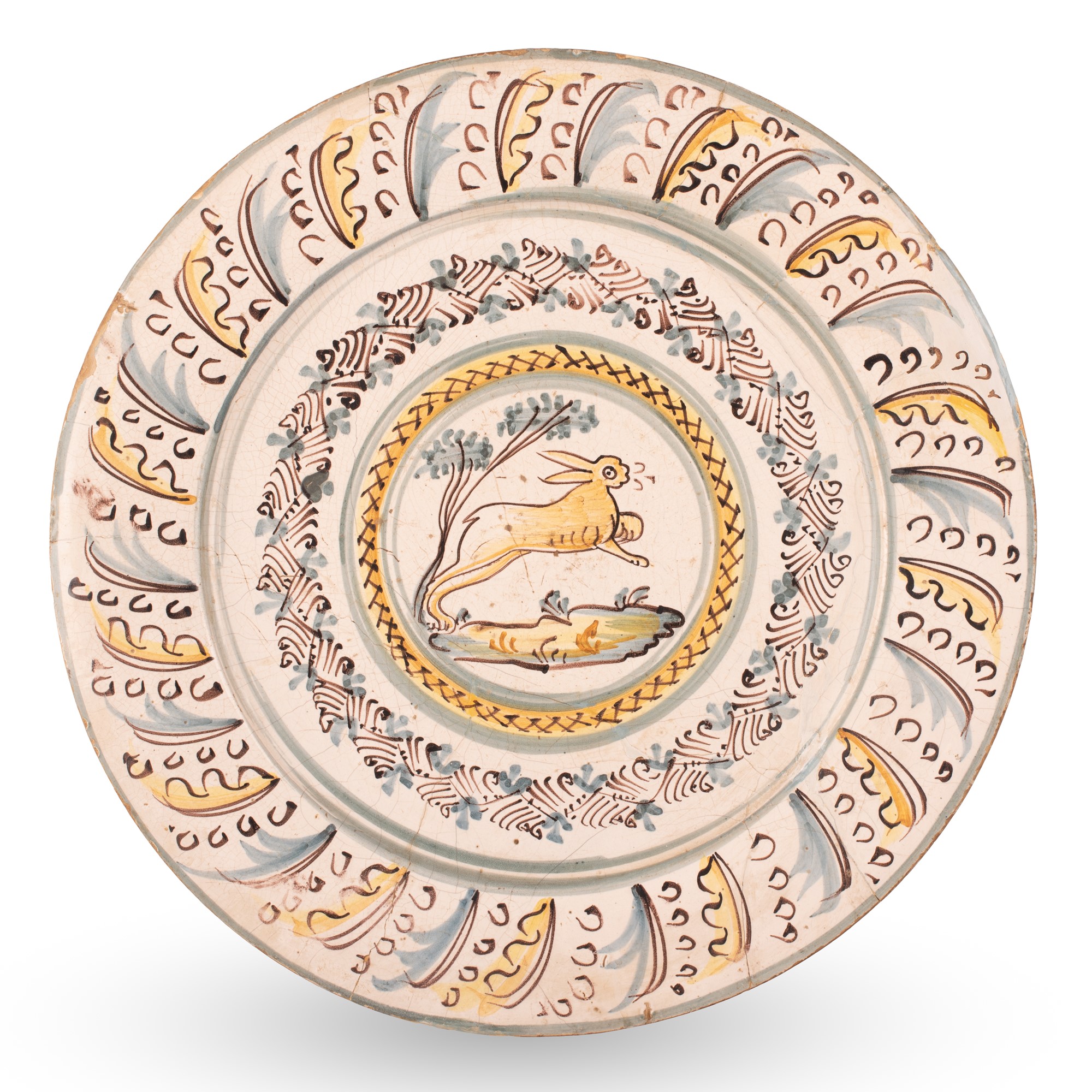 Manifattura di Bussi sul Tirino del XVII secolo ( - ) Maiolica a gran fuoco decorata nello stile compendiario, tesa con piume di struzzo stilizzate nei toni del blu e giallo, cavetto con decoro vegetale e lepre in fuga in un paesaggio. Ø cm 41