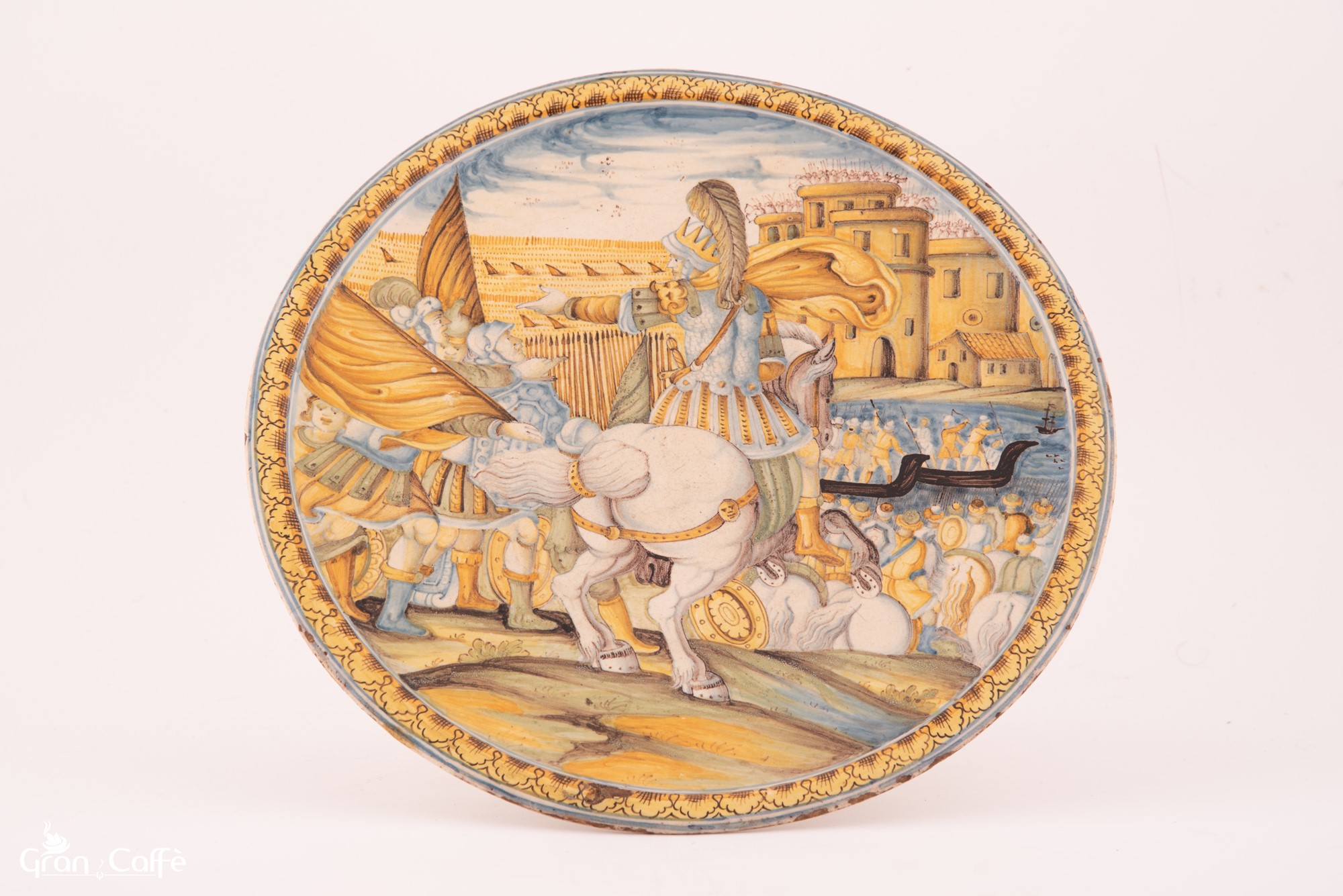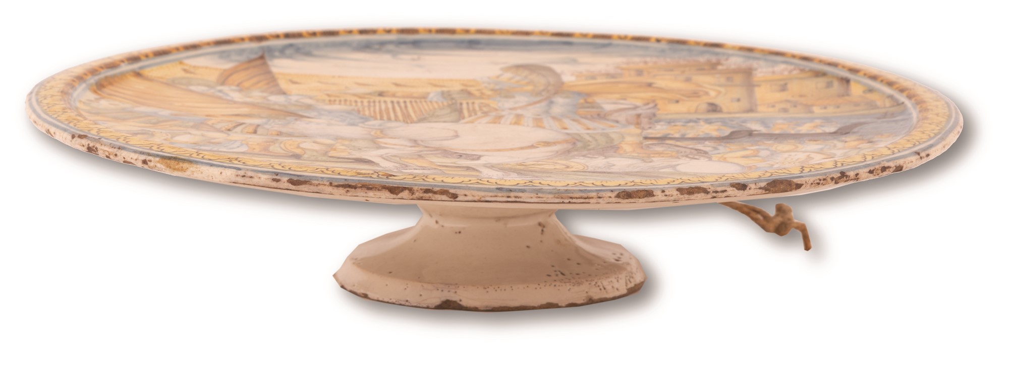 Alzata in maiolica istoriata con una scena bellica. La presa di Gerusalemme. Il soggetto in primo piano rimanda a una incisione del Tempesta. Ø cm 28
