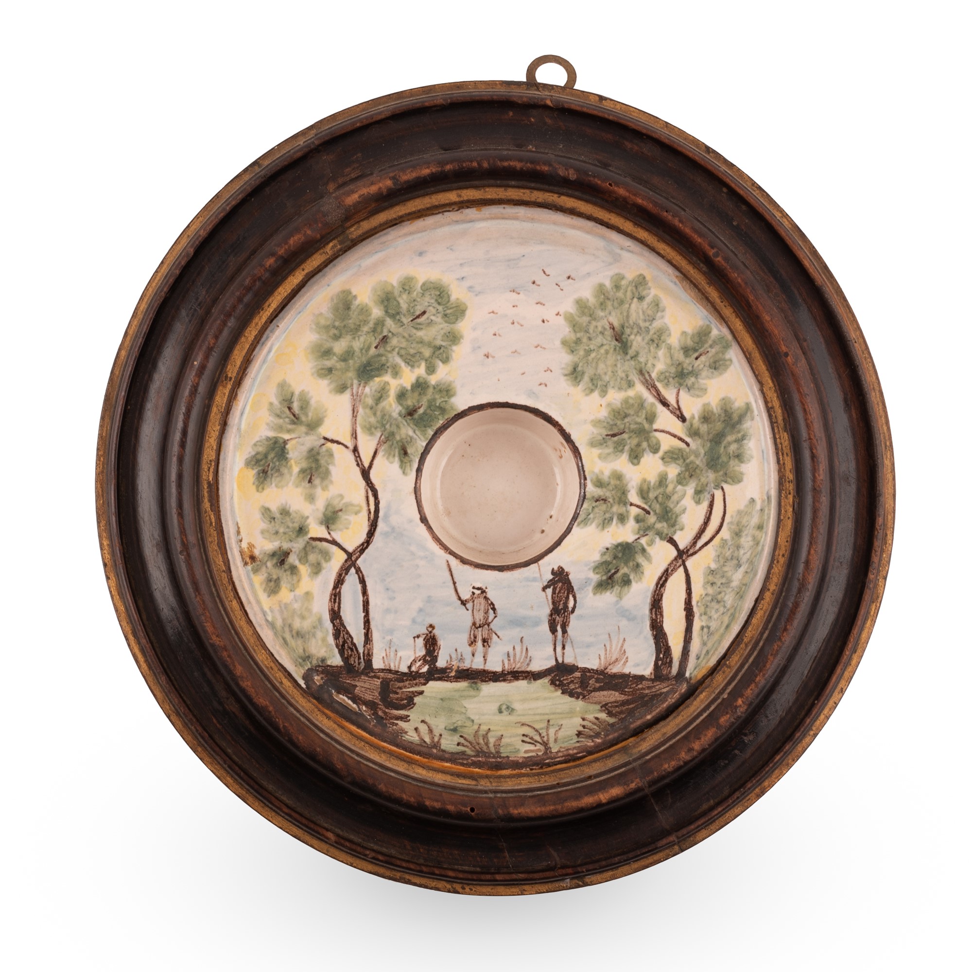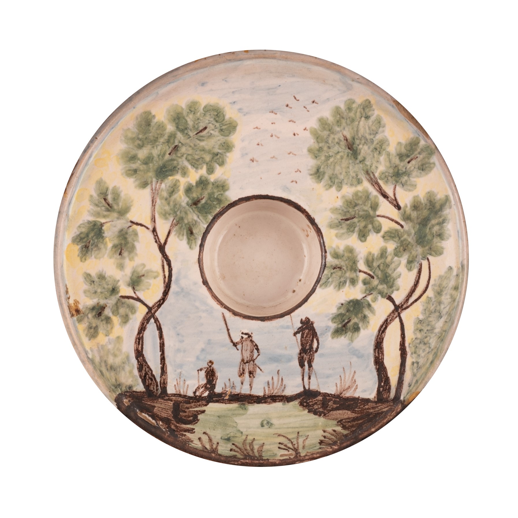 Manifattura castellana della seconda metà del XVIII secolo ( - ) Piattello portachicchera decorato con paesaggio e figure Ø cm 18