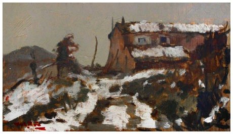 ANGIOLO VOLPE Livorno 1943 Presso il Gabbro Olio su tavola 18 x 32. Firma in b. a s.; sul verso dedica, firma e titolo.