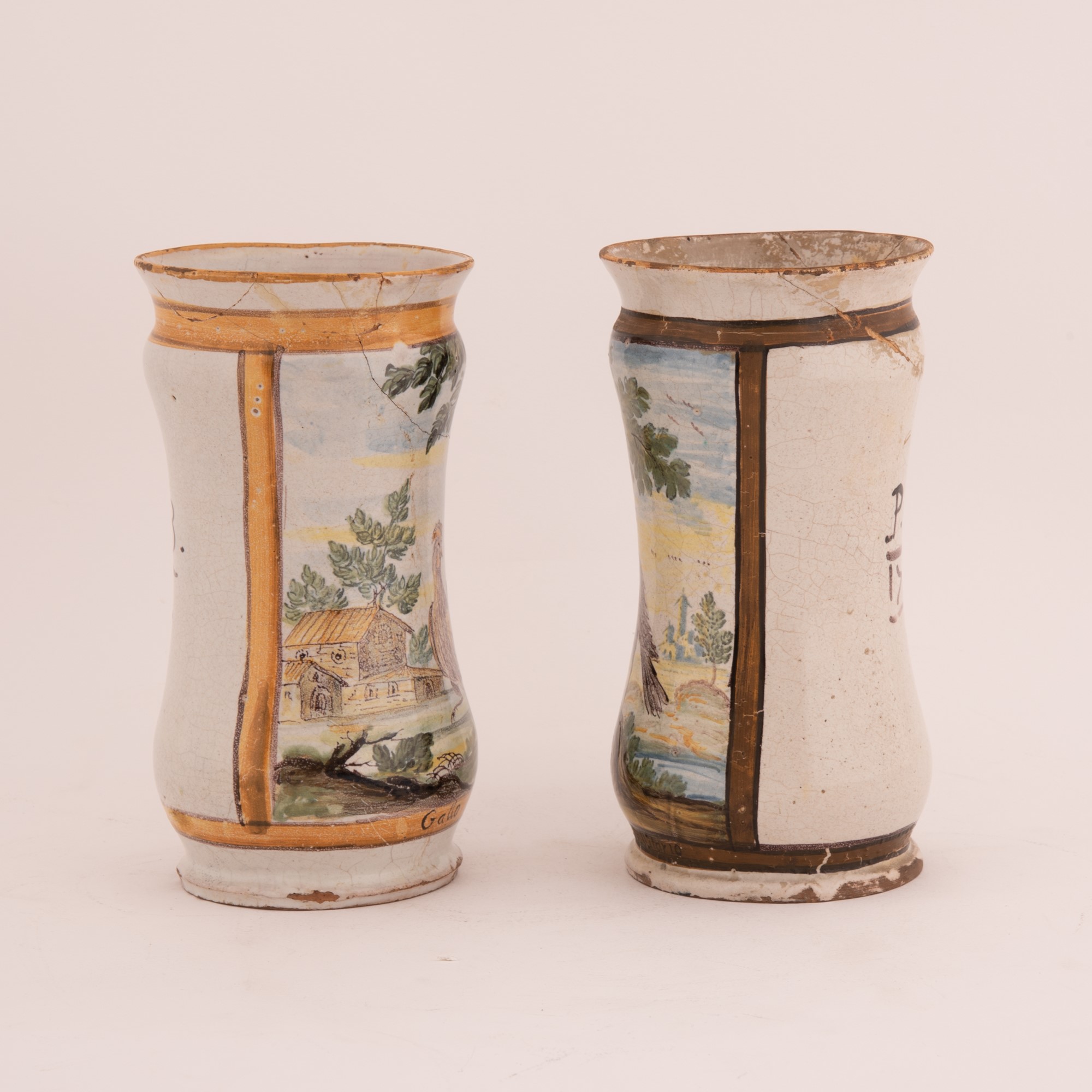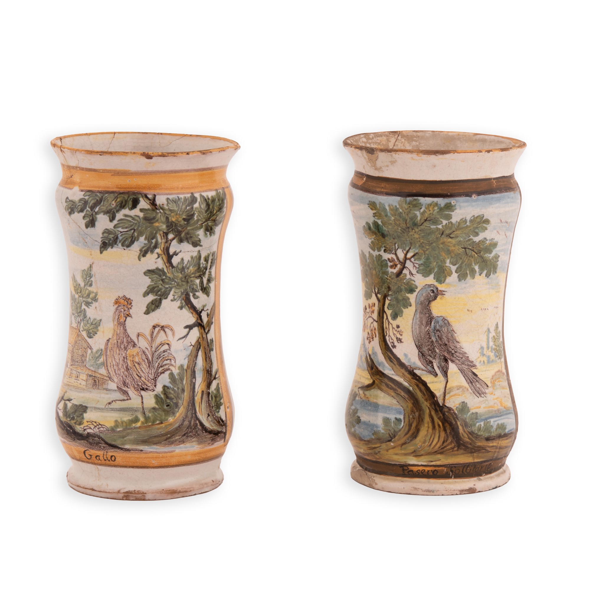 Manifattura castellana del XVIII secolo ( - ) Coppia di albarelli in maiolica decorati in policromia. Al centro rappresentati rispettivamente un gallo e un passero in paesaggio. cm 20x10