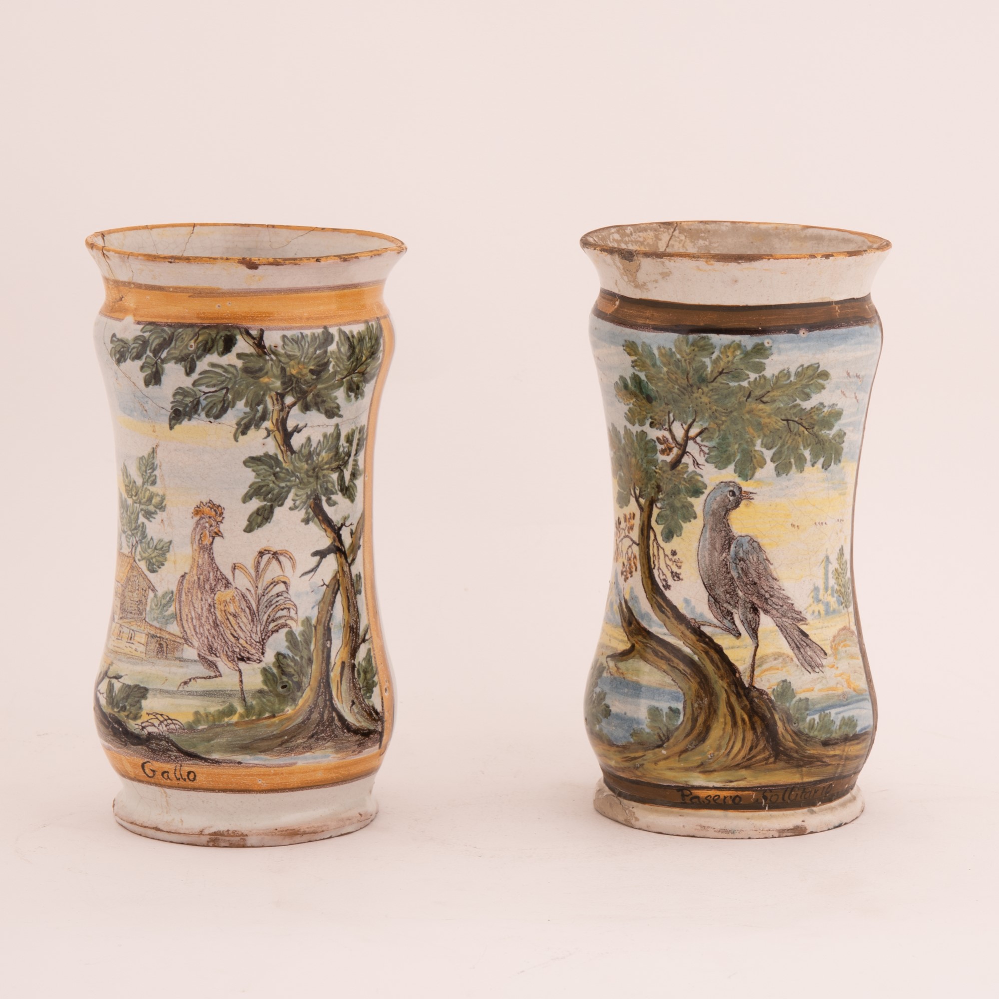 Coppia di albarelli in maiolica decorati in policromia. Al centro rappresentati rispettivamente un gallo e un passero in paesaggio. cm 20x10