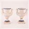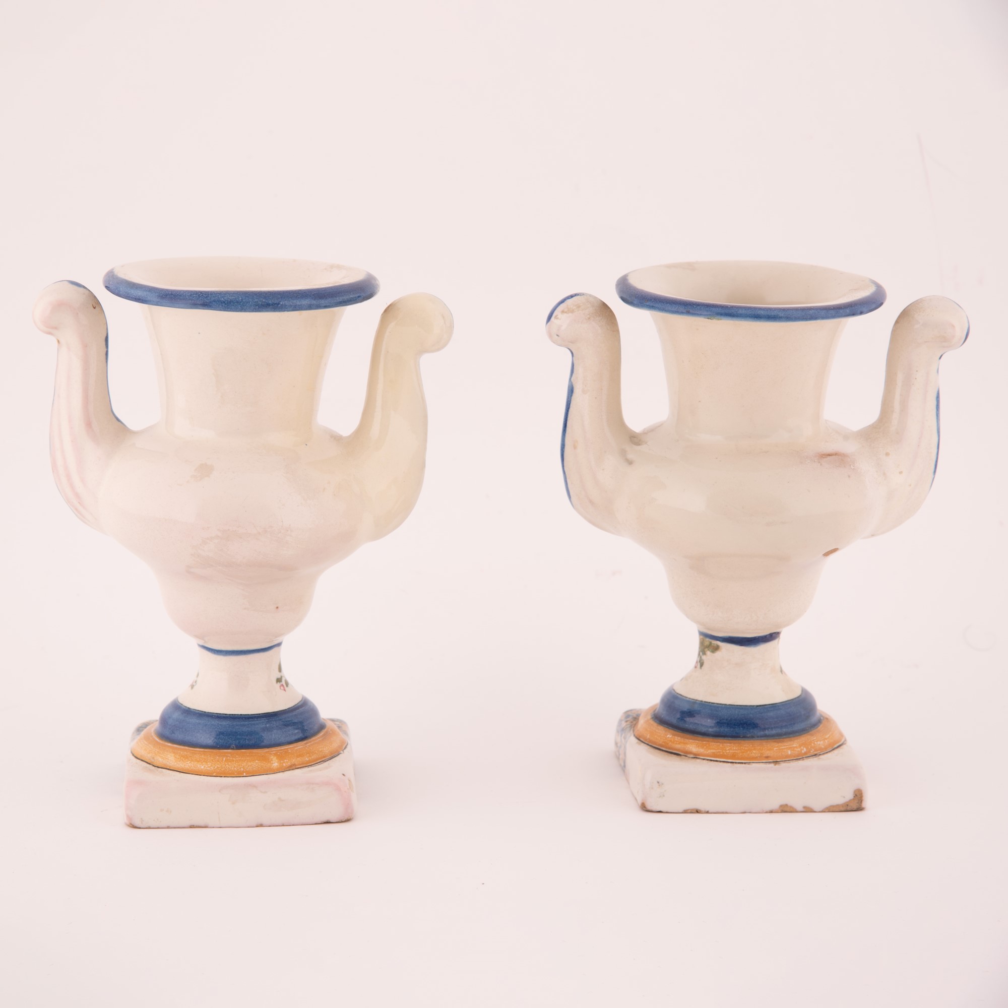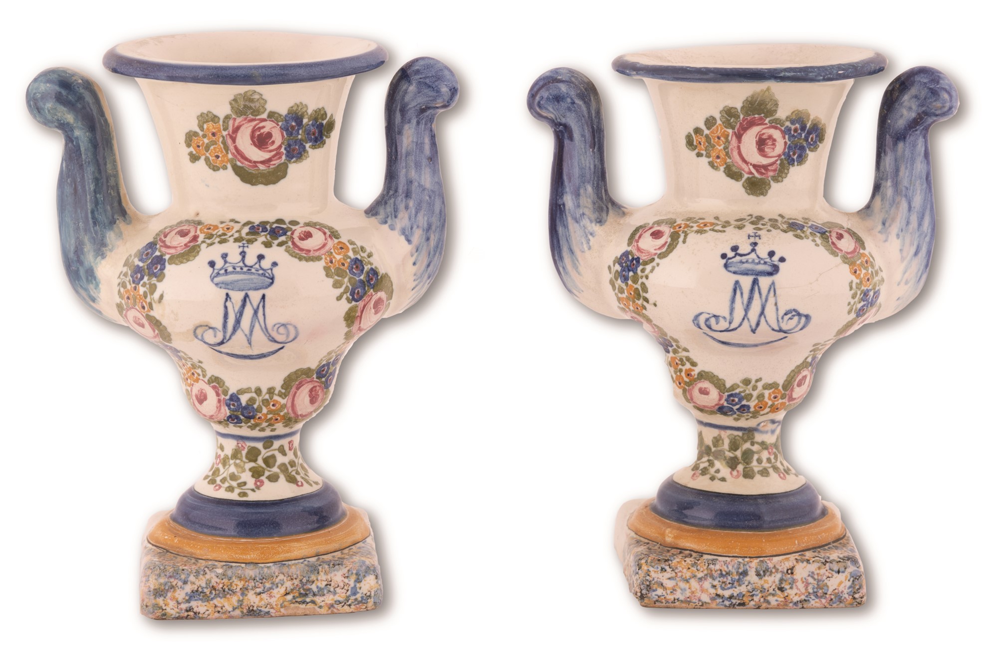 Coppia di vasi da altare in maiolica recanti monogramma mariano coronato, incorniciato da una ghirlandina fiorita cm 17x13,5 Difetti e restauri