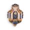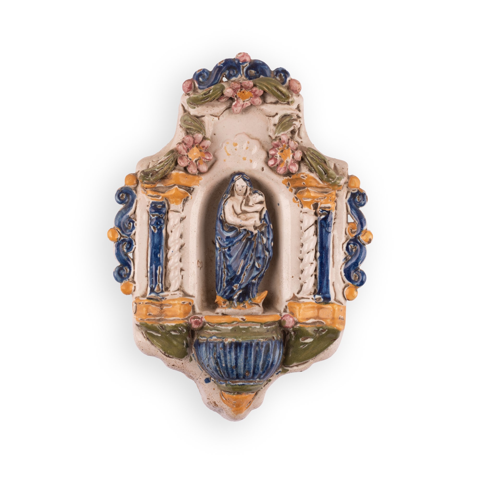 Acquasantiera in maiolica decorata con elementi a rilievo e nell'edicola centrale, con l'effigie della Madonna con il Bambino. cm 26x18,5 Difetti e mancanze