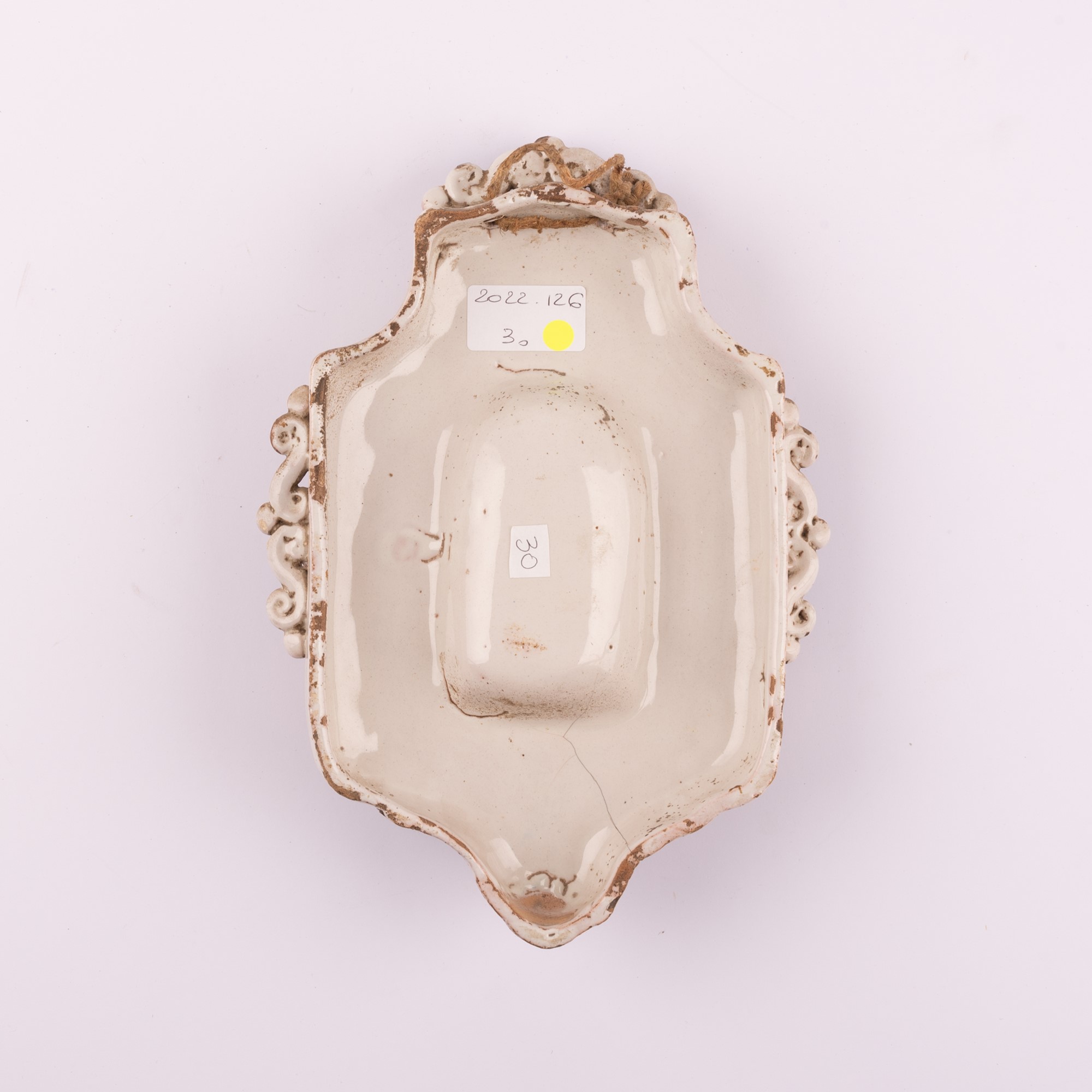 Manifattura castellana attiva tra la fine del XVIII e la prima metà del XIX secolo ( - ) Acquasantiera in maiolica decorata con elementi a rilievo e nell'edicola centrale, con l'effigie della Madonna con il Bambino. cm 26x18,5