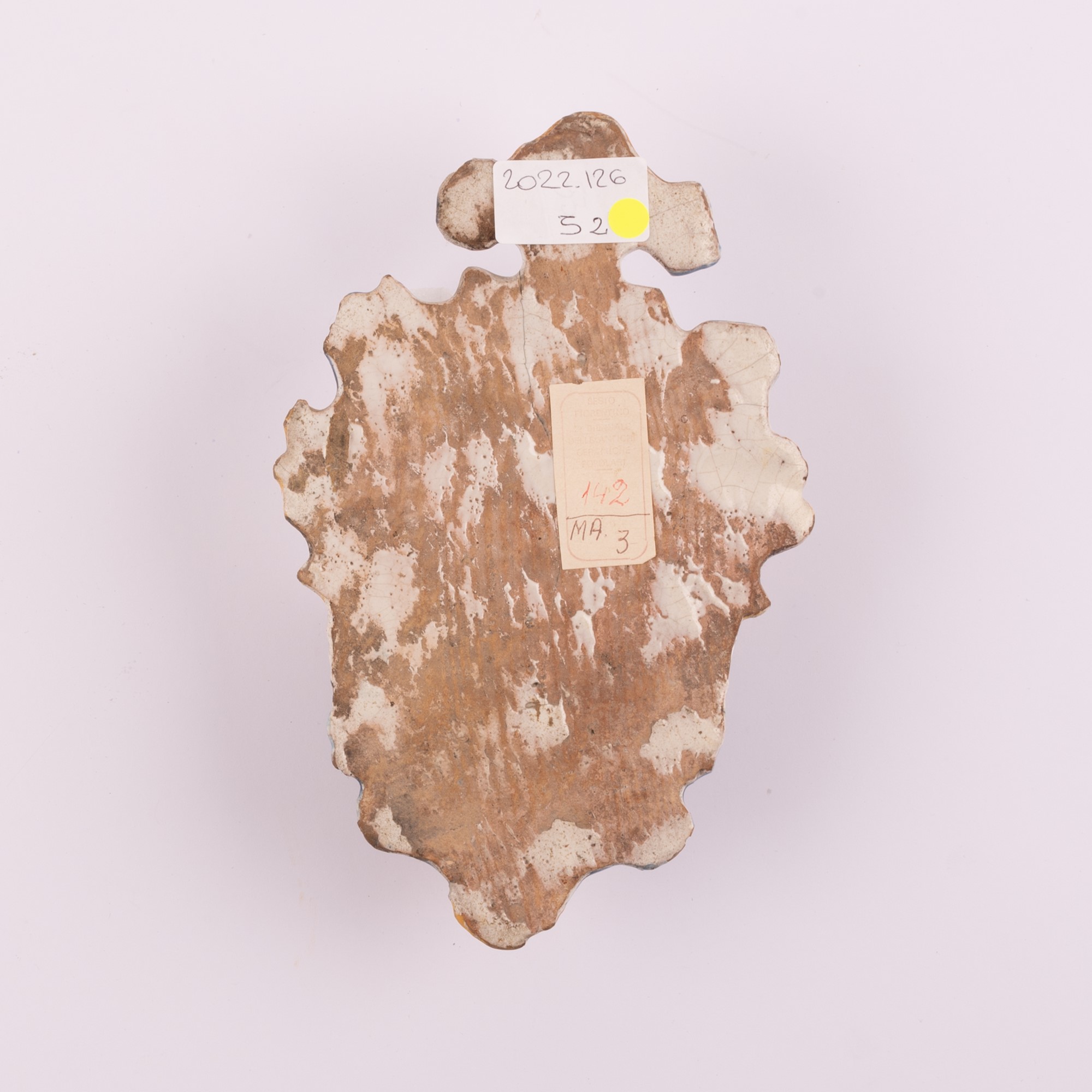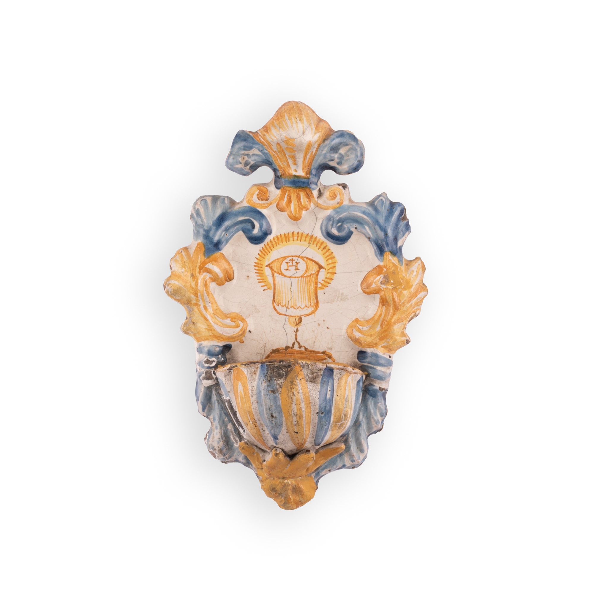Acquasantiera in maiolica con decori a rilievo centrati dai simboli eucaristici cm 20,5x14 Lesioni e difetti