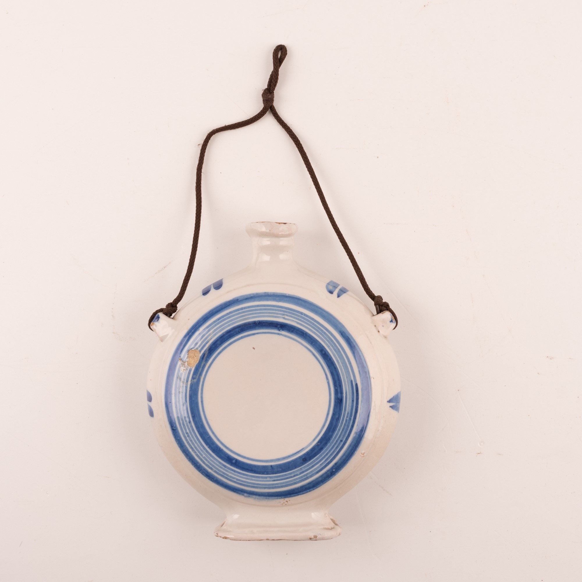 Manifattura abruzzese attiva tra il tardo XIX ed i primi del XX secolo. ( - ) Fiaschetta in maiolica da "pellegrino" con motivi decorativi circolari realizzati in monocromia blu. cm 22x18