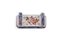 Schiacciapatate in maiolica policroma. Al centro su fondo bianco decorato con una rosa. Sul doppio manico e sul perimetro motivo in blu realizzato a spugnetta. cm 8x23x10