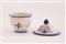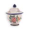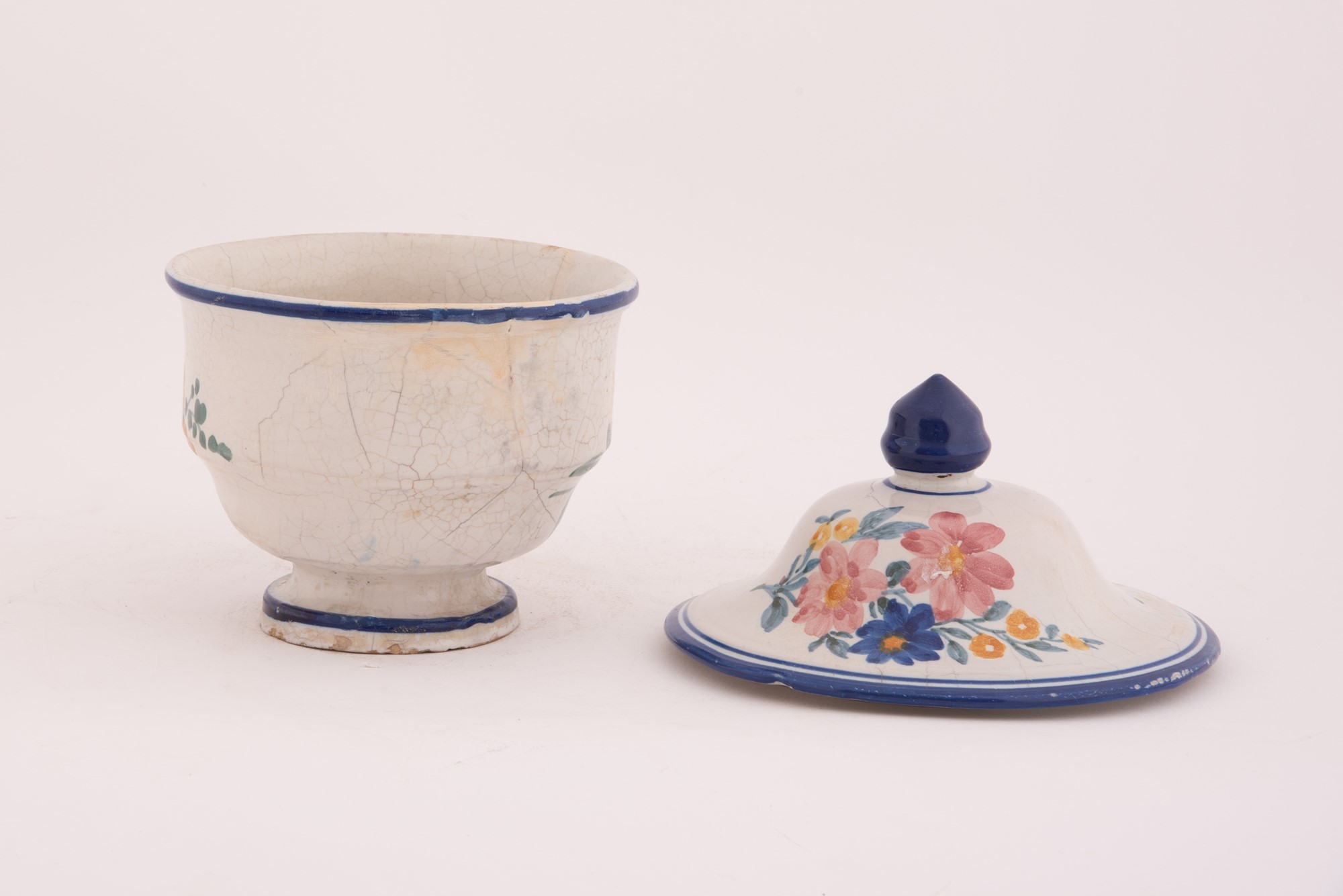 Zuppiera in maiolica con decorazione floreale e bordature in blu. con coperchio cm 18x16; senza coperchio cm 12,5x16