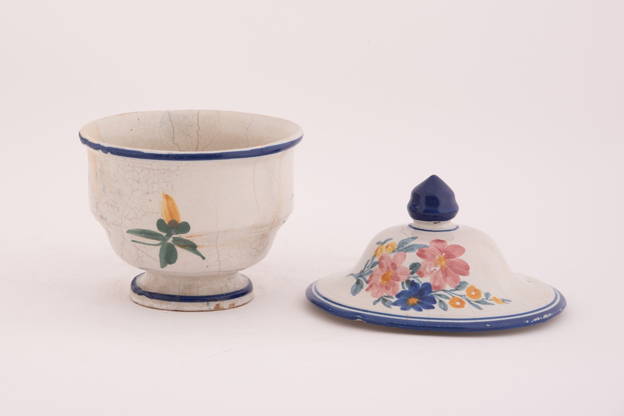 Manifattura castellana del XIX secolo ( - ) Zuppiera in maiolica con decorazione floreale e bordature in blu. con coperchio cm 18x16; senza coperchio cm 12,5x16