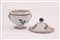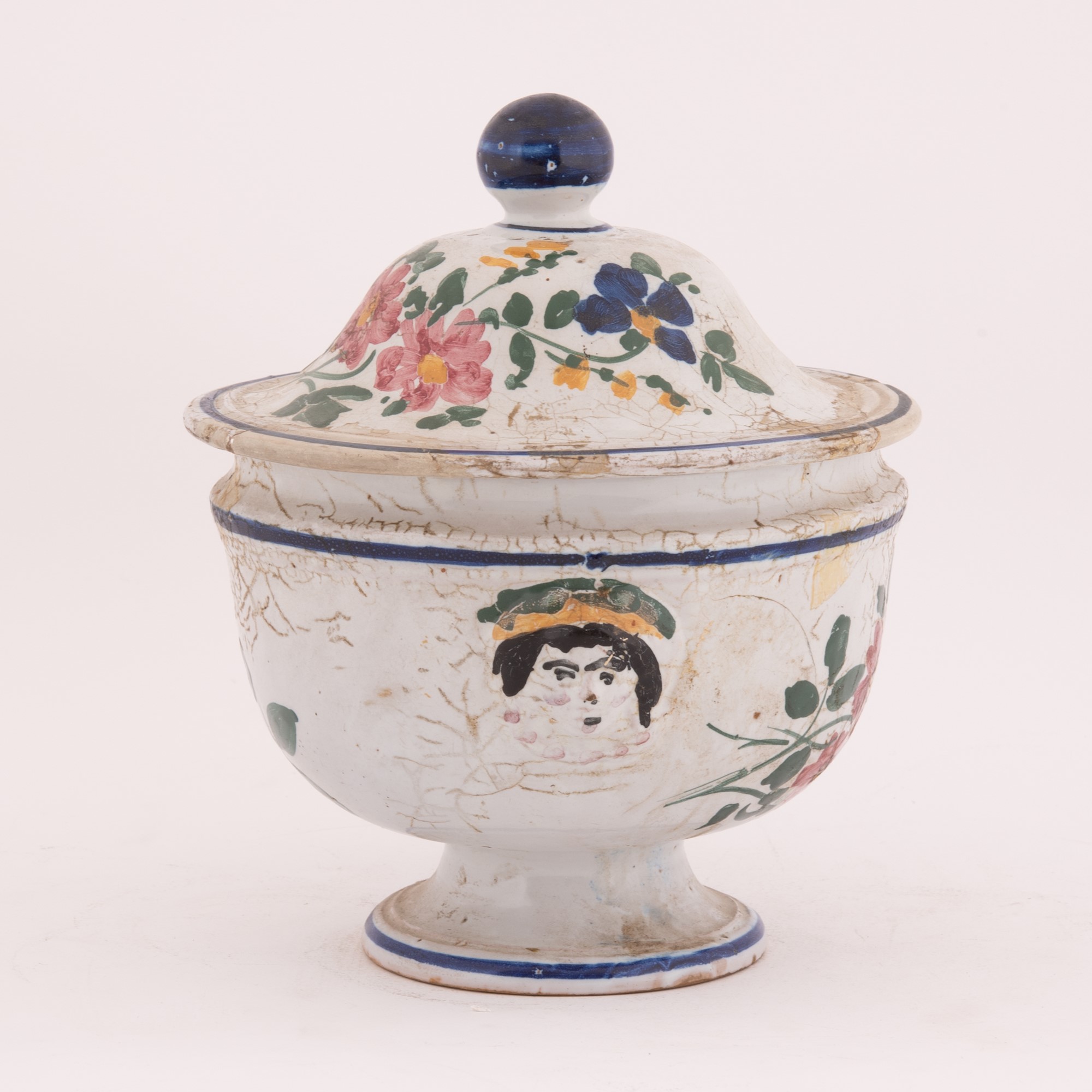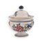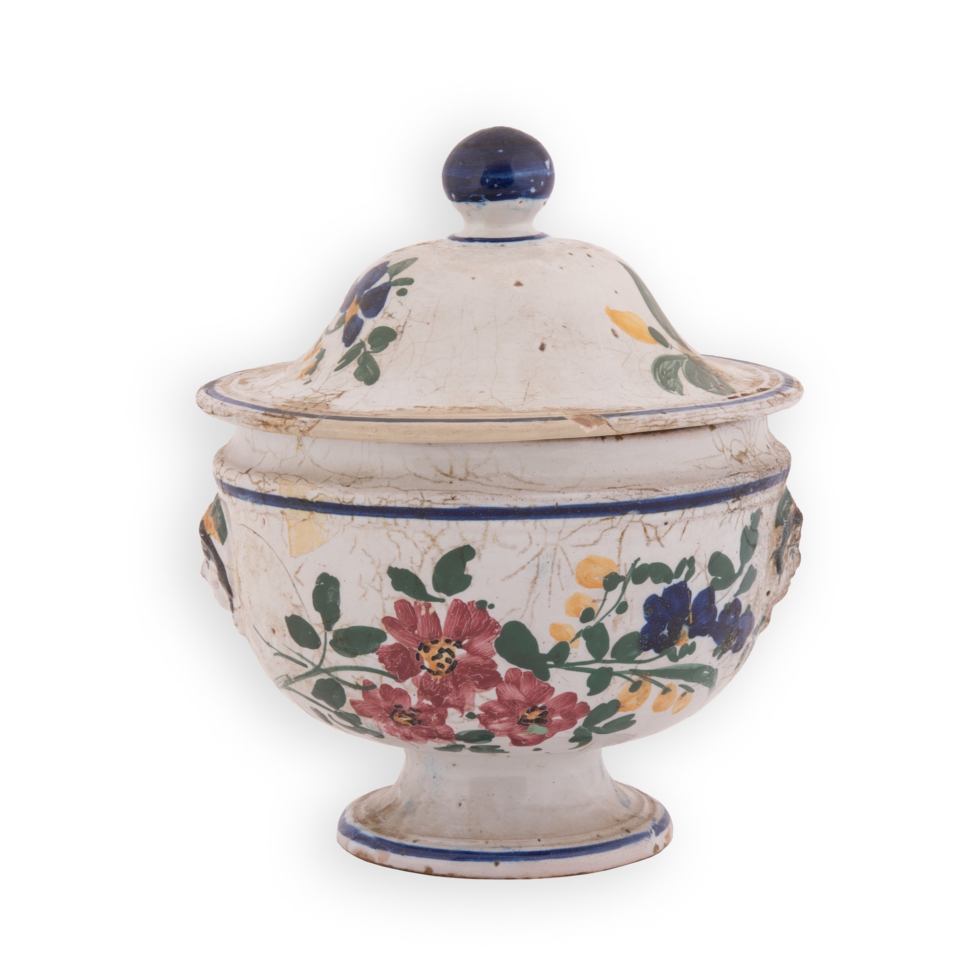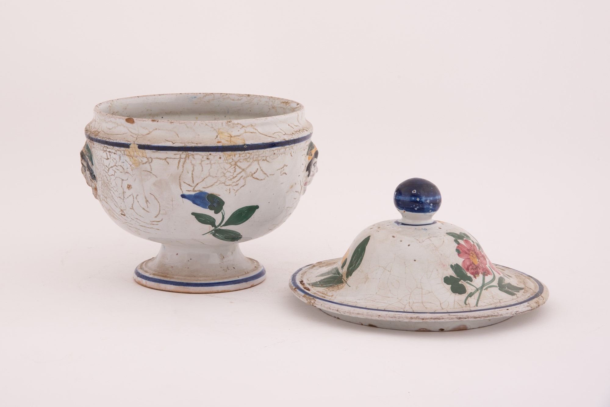 Manifattura castellana del XIX secolo ( - ) Zuppiera in maiolica decorata in policromia con motivi floreali e bordature in blu. Ai lati mascheroni. Coperchio con presa sferica in blu. con coperchio cm 25x21; senza coperchio cm 17x21