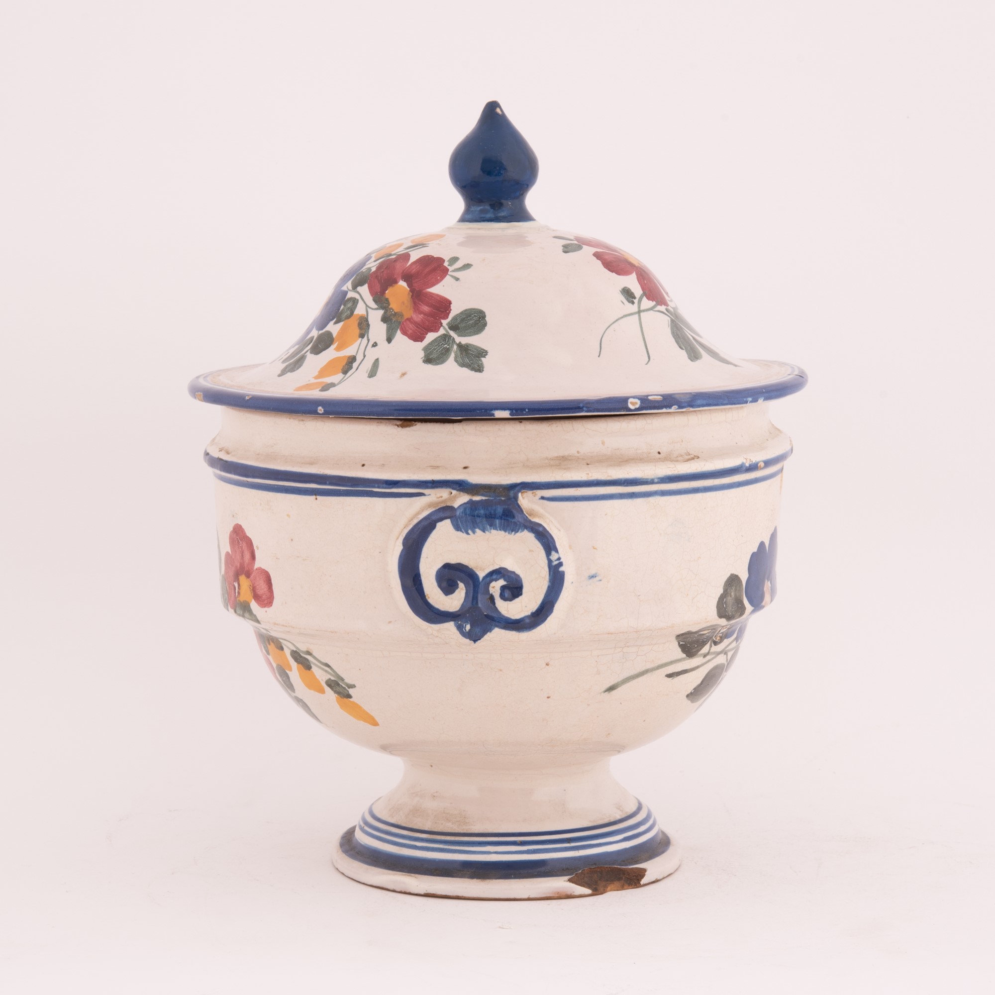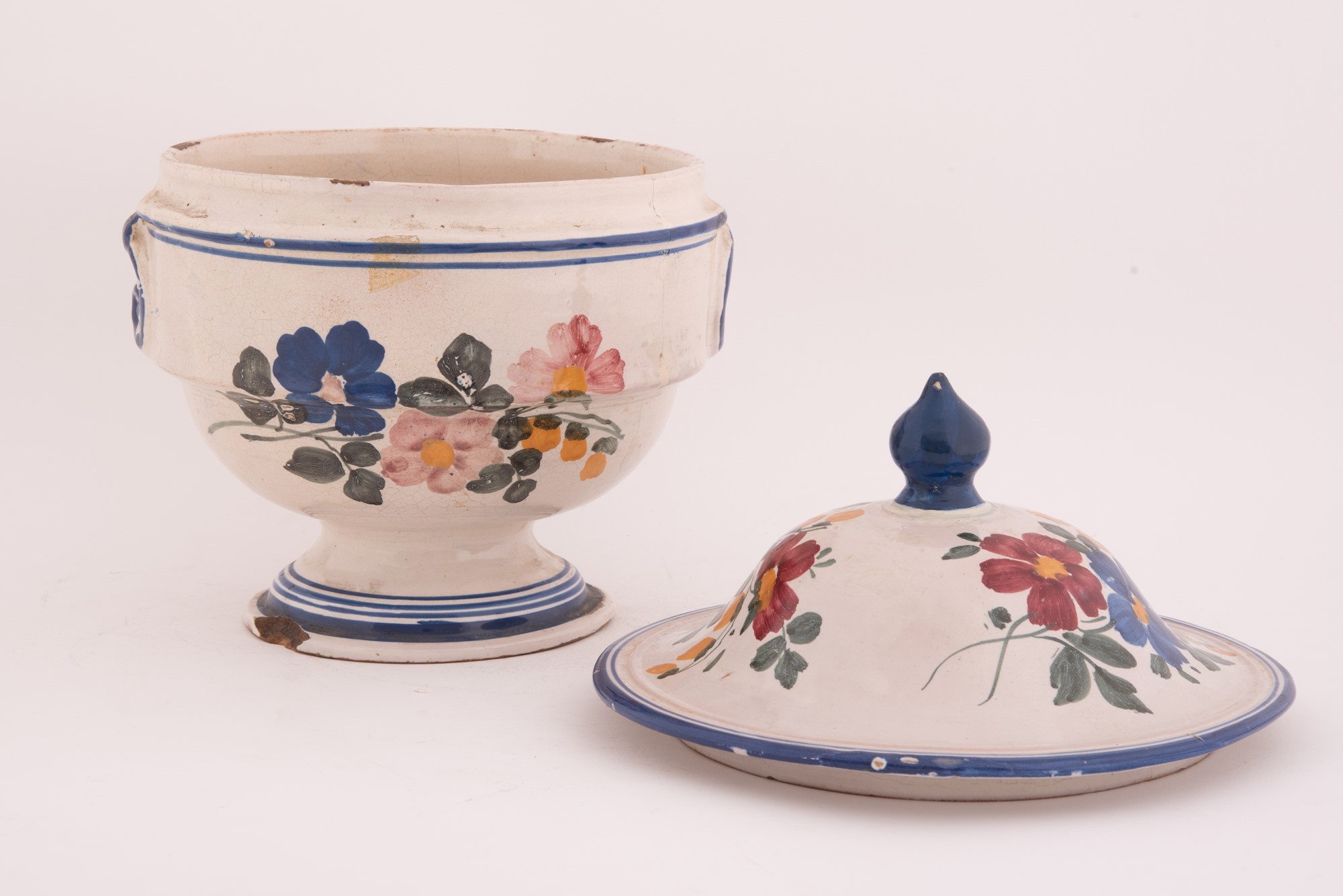 Lotto 133 | Manifattura castellana del XIX secolo ( - ) Zuppiera in maiolica decorata in policromia con motivi floreali e bordatura in blu. Ai lati maniglie incavate. Coperchio con presa in blu. con coperchio cm 27x21; senza coperchio cm 18,5x21