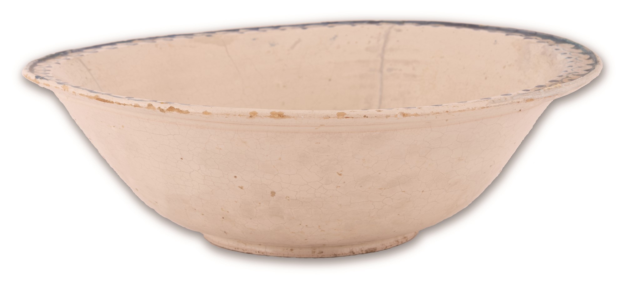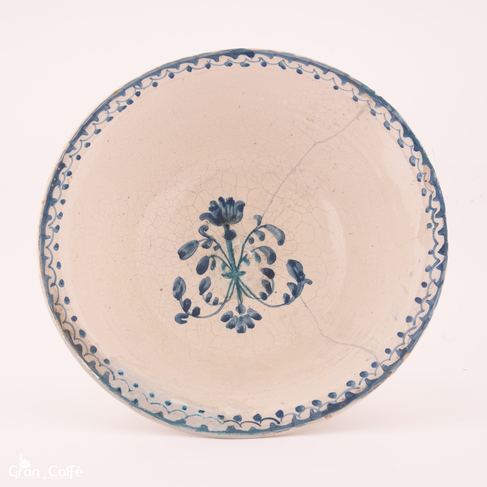 Bacile in maiolica decorato in monocromia azzurra con elementi fitomorfi costituenti un monogramma nel cavo. Ø cm 31 Rotture e restauri