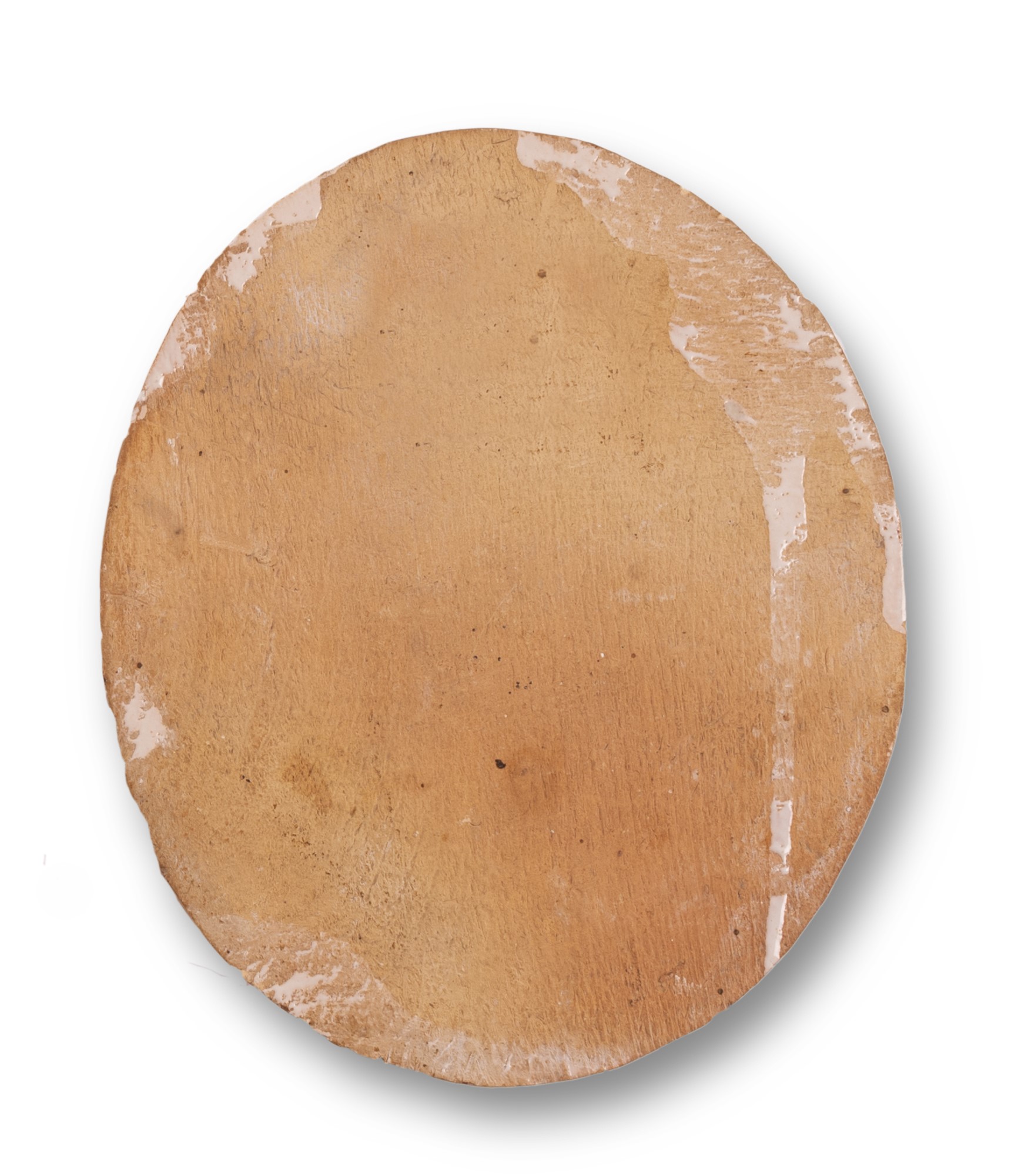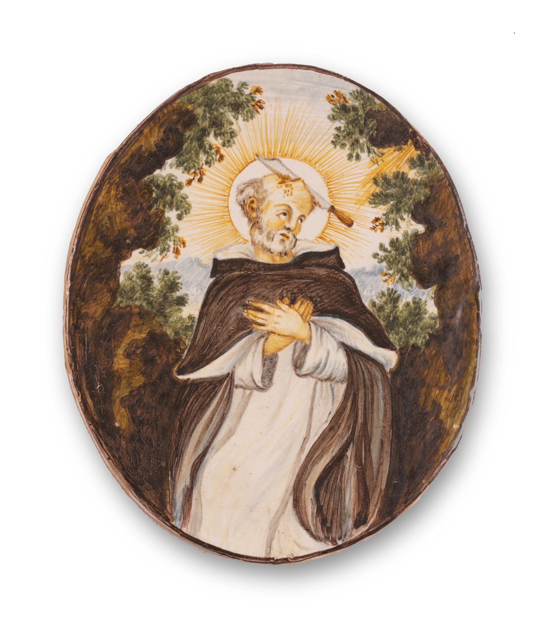 Francesco Saverio Grue (Castelli, 1720 - Castelli, 1755) Mattonella maiolicata ovale raffigurante un Santo Vescovo. cm 18x15