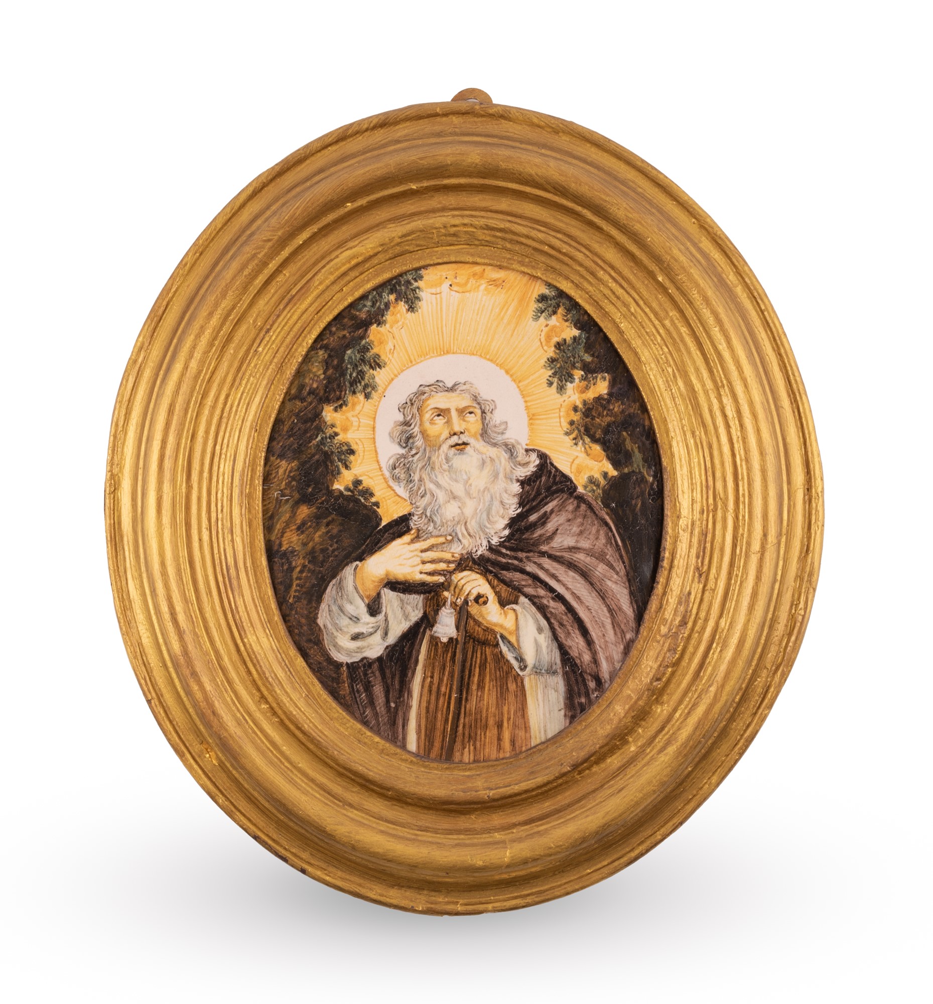 Lotto 146 | Aurelio Anselmo Grue (Castelli, 1699 - Castelli, dopo il 1951) Mattonella maiolicata ovale decorata con l'effigie di Sant'Antonio Abate. cm 20x16