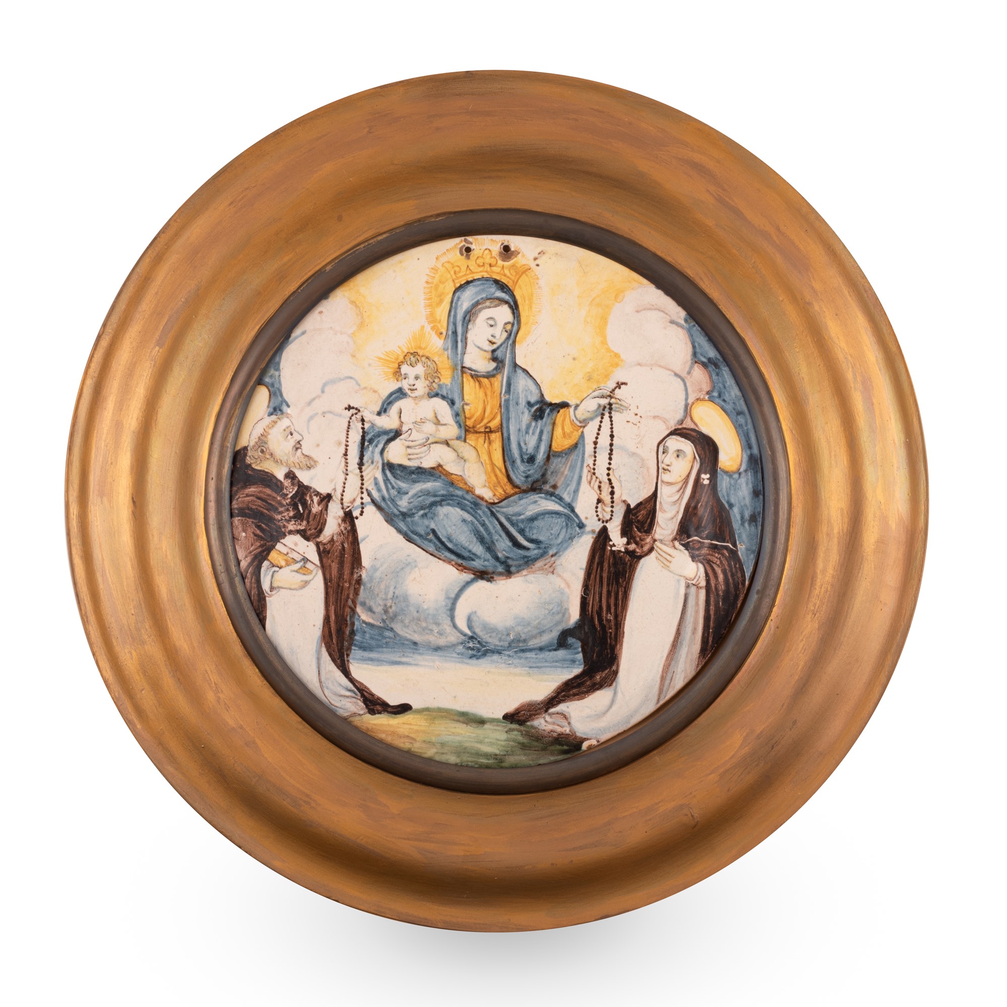 Maestro castellano attivo tra la fine del XVII ed il primo decennio del XVIII secolo ( - ) Tondo in maiolica raffigurante la Madonna del Rosario tra i Santi Domenico di Guzman e Caterina da Siena. Ø cm 23