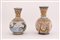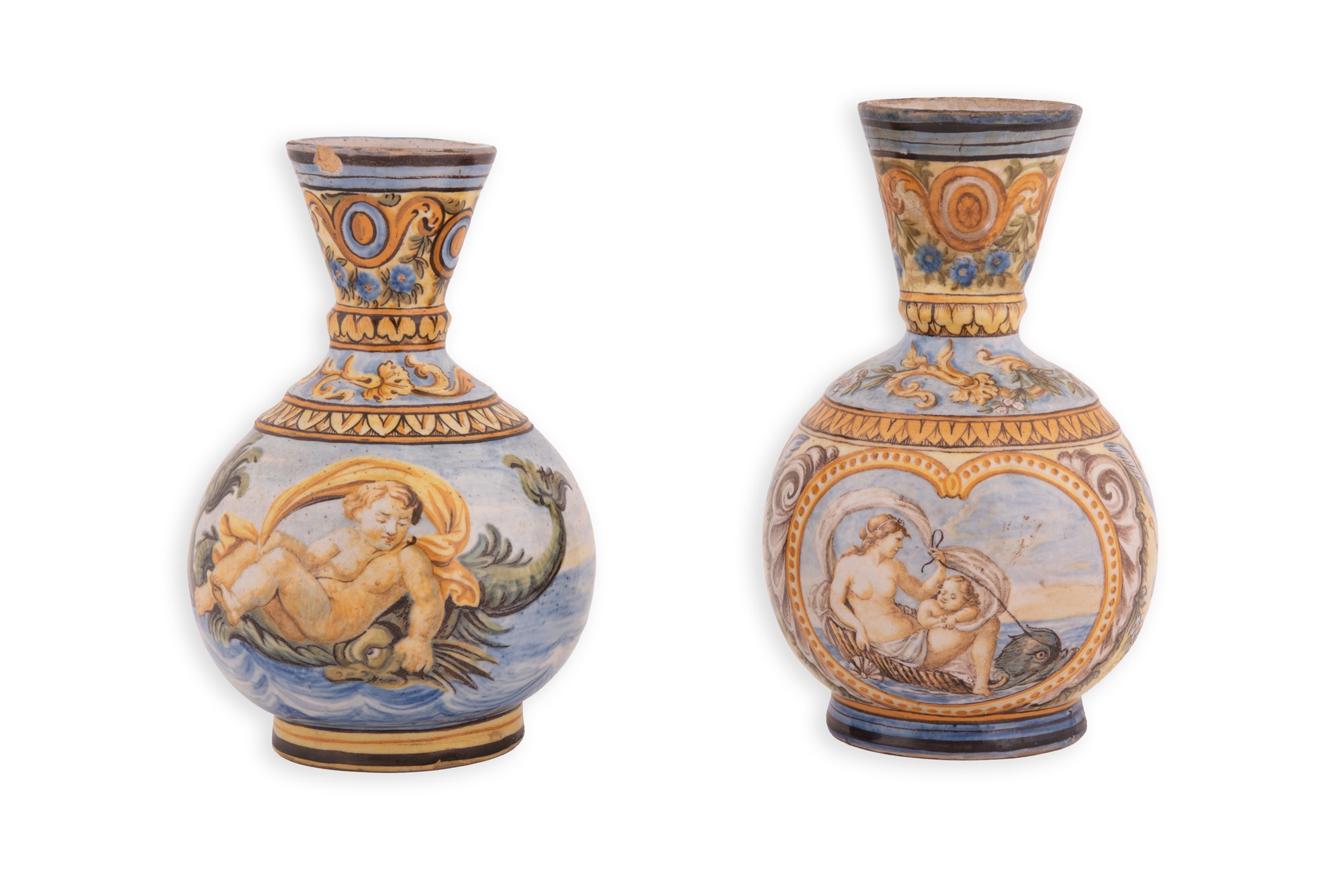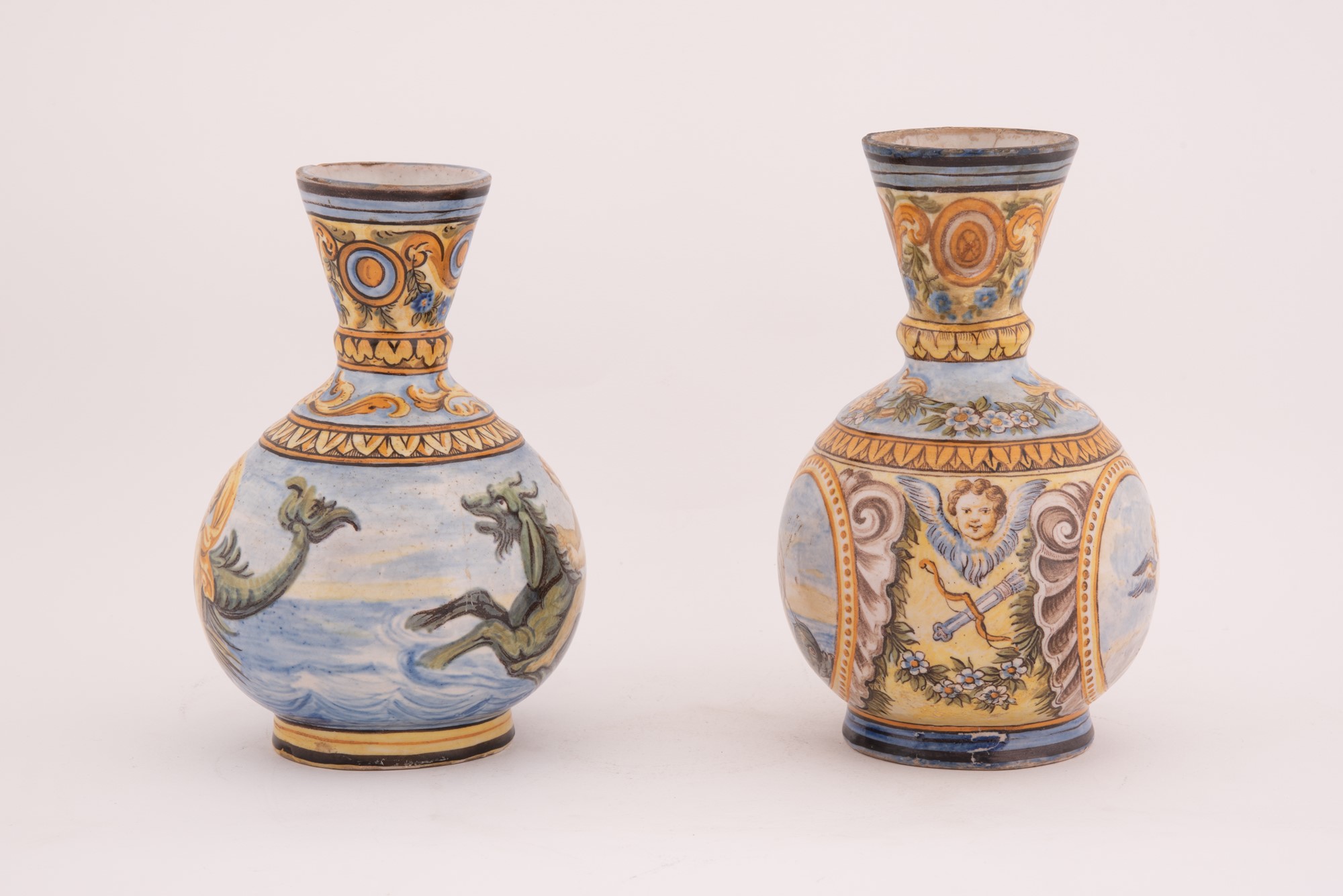 Manifattura castellana della seconda metà del XVIII secolo ( - ) Coppia di bottiglie in maiolica decorate in policromia con festoni ed elementi rocaille. Sul corpo scene con putti, cupido, Venere e tritoni in paesaggi marini. XIX secolo cm 22x12