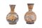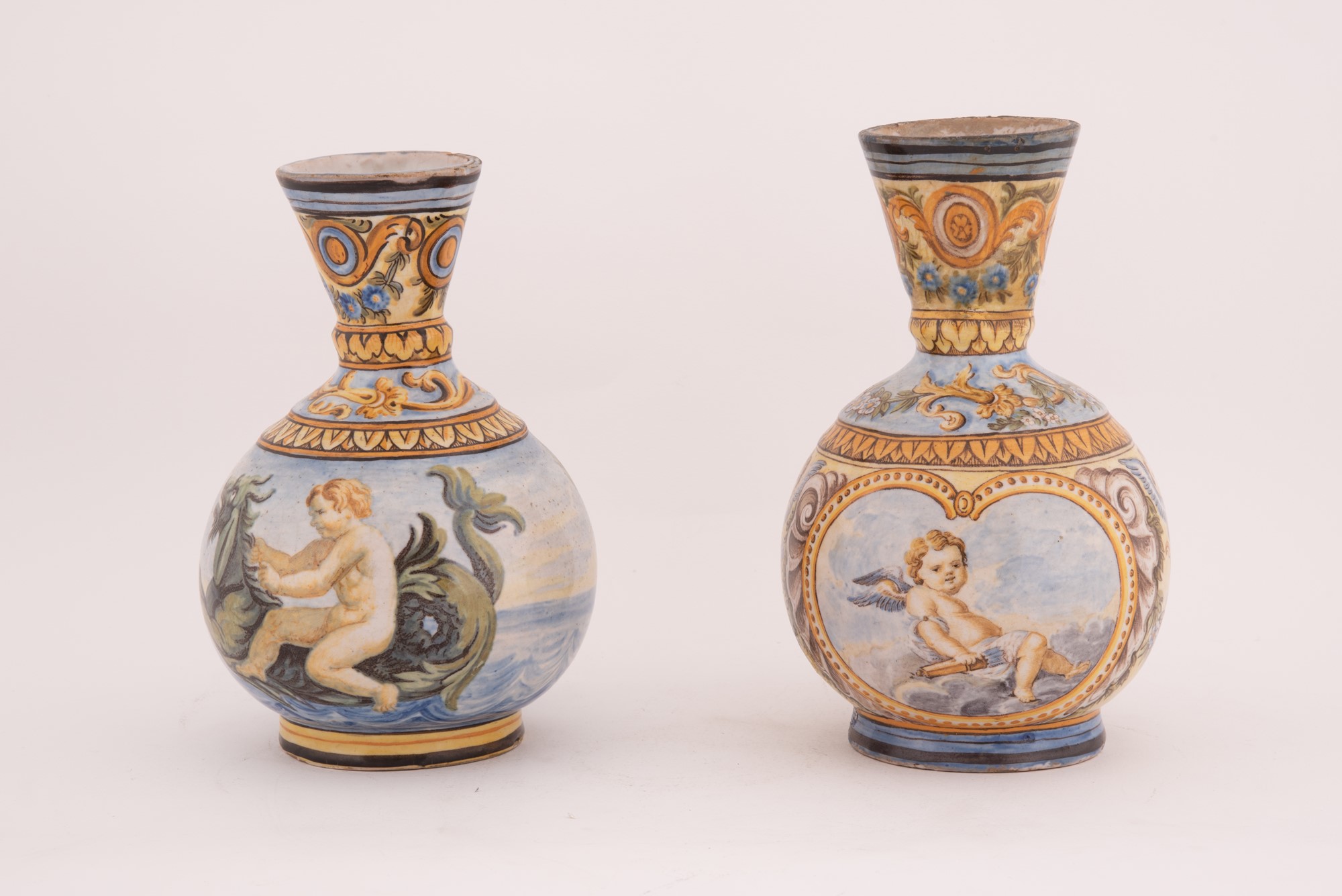 Coppia di bottiglie in maiolica decorate in policromia con festoni ed elementi rocaille. Sul corpo scene con putti, cupido, Venere e tritoni in paesaggi marini. cm 22x12 XIX secolo Rotture e restauri