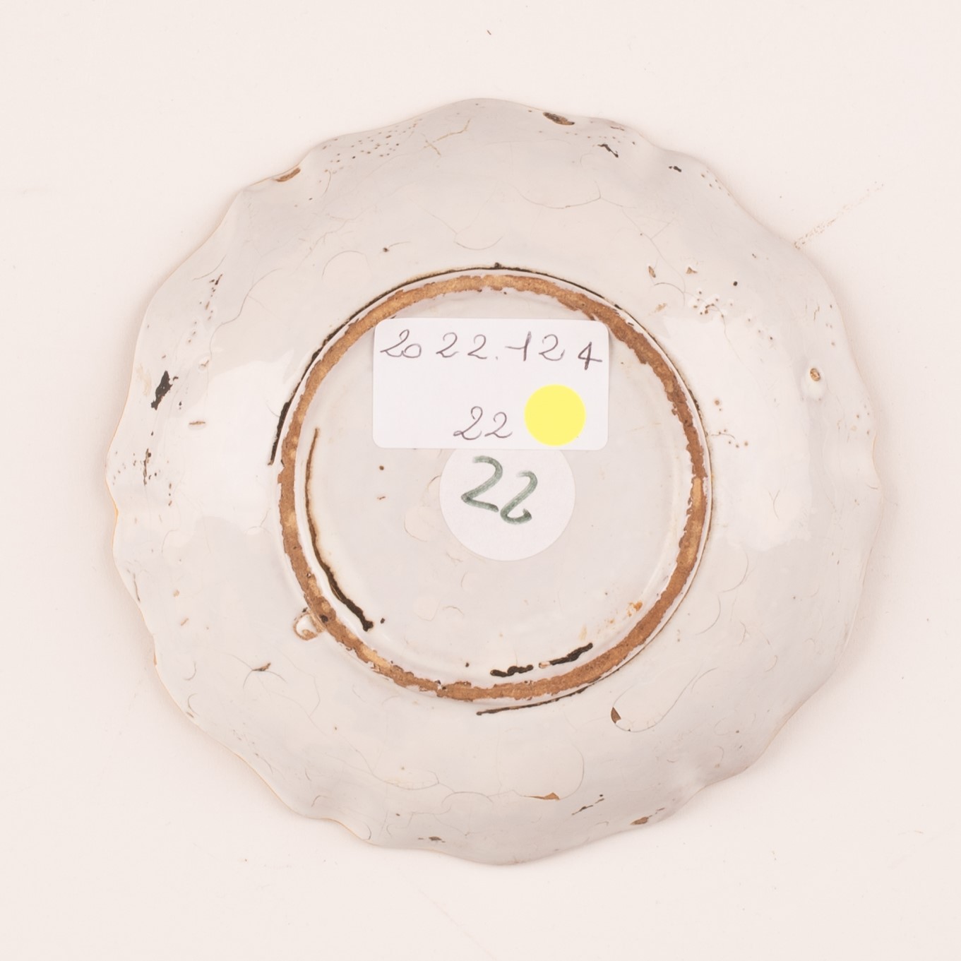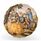 Coppetta in maiolica decorata in policromia con scena galante e paesaggio con figure e case sullo sfondo. Ø cm 12,5 Bordo mistilineo in giallo e manganese