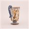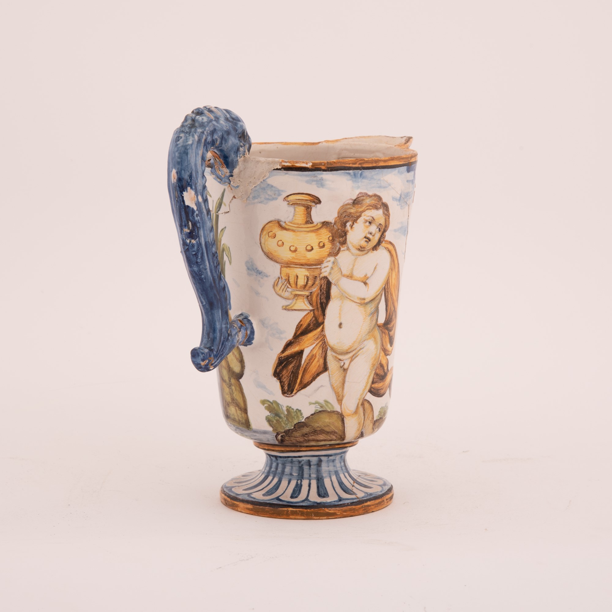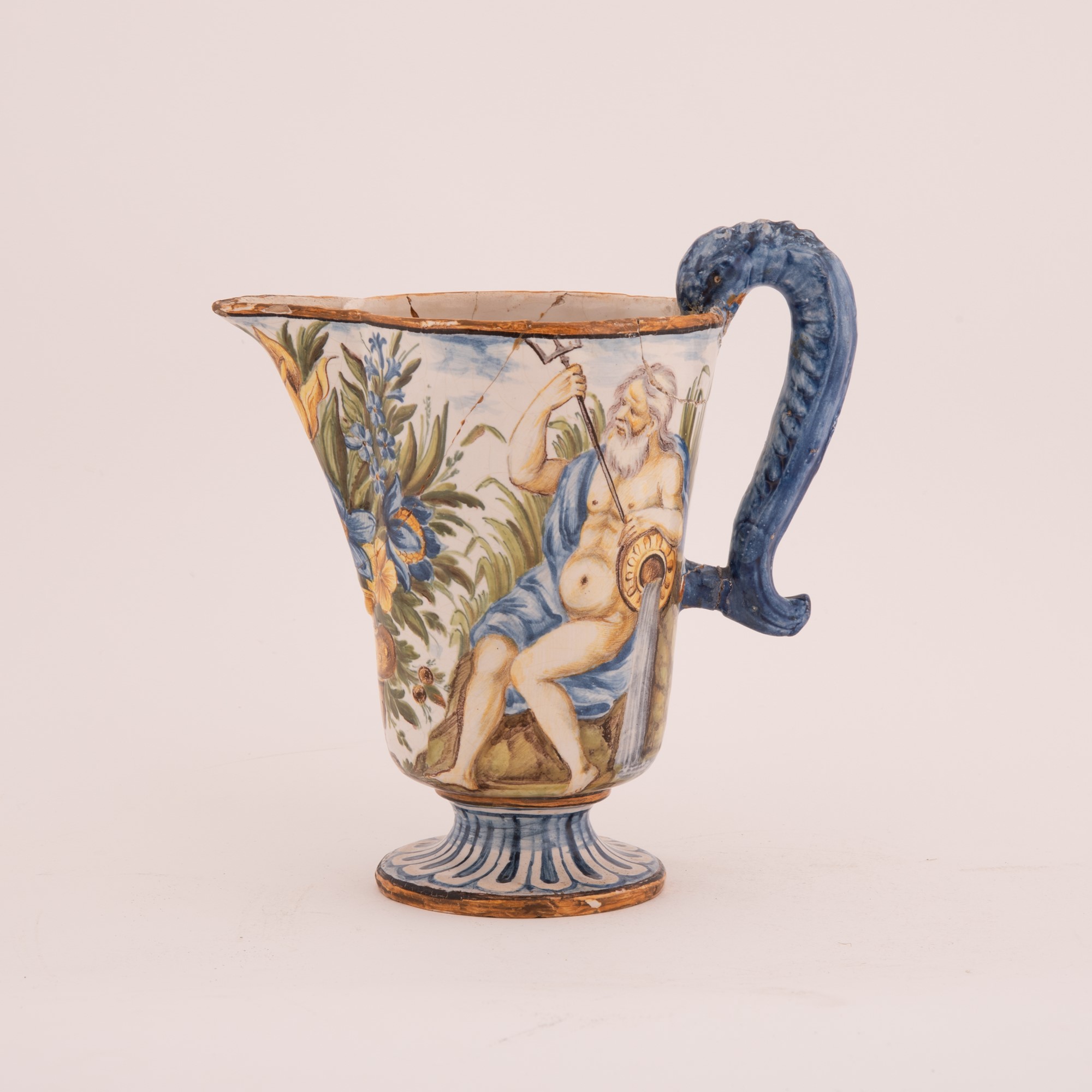 Manifattura castellana del XVII secolo ( - ) Versatoio in maiolica decorato in policromia con vaso baccellato e fiori sul fronte. Ai lati personaggi mitologici. Presa zoomorfa in blu cobalto. cm 18x20