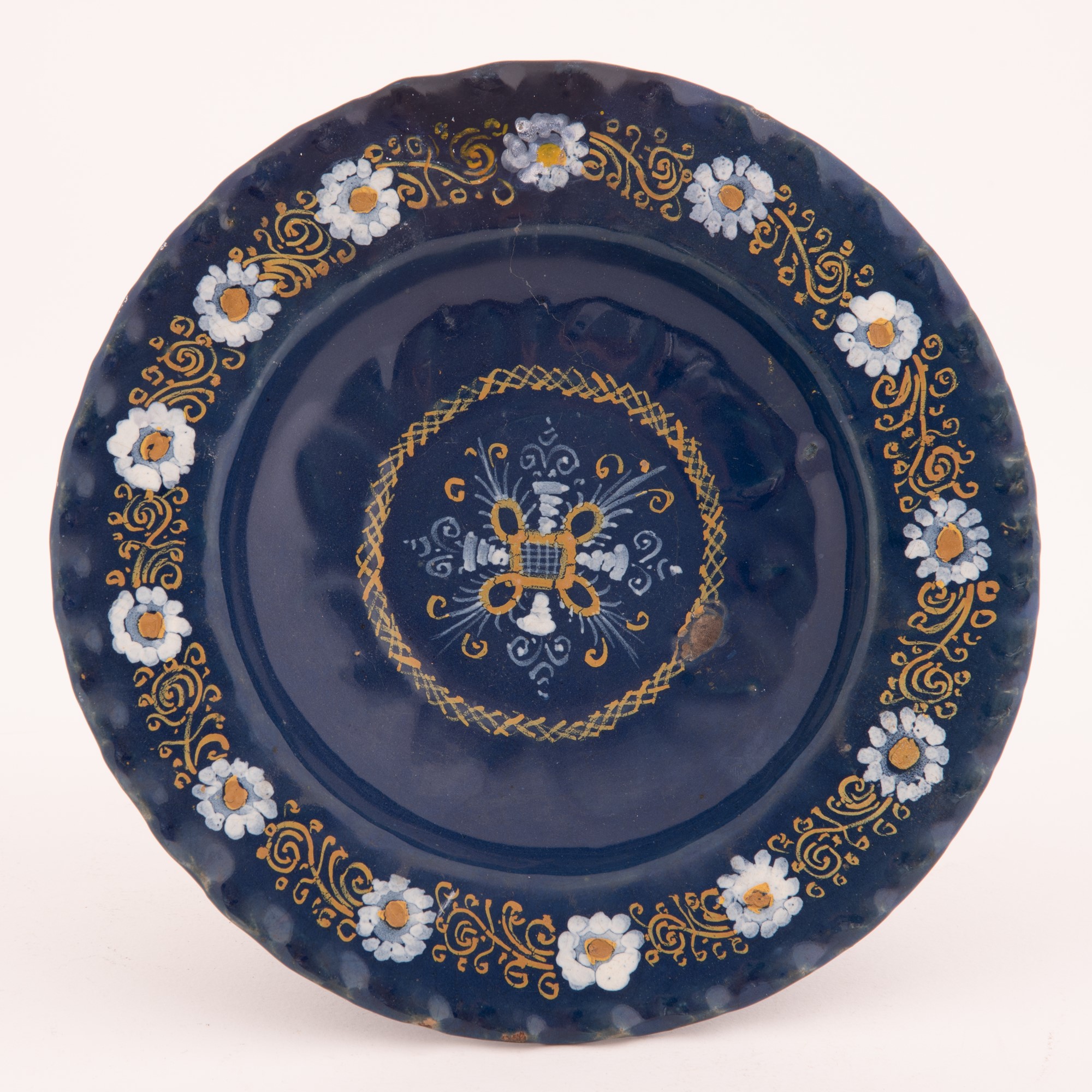 Corpo circolare a fondo blu, con tesa baccellata decorata con fiori bianchi e motivi floreali dorati. Al centro cavetto decorato con motivo floreale quadrilobato contenuto entro ghirlanda dorata.