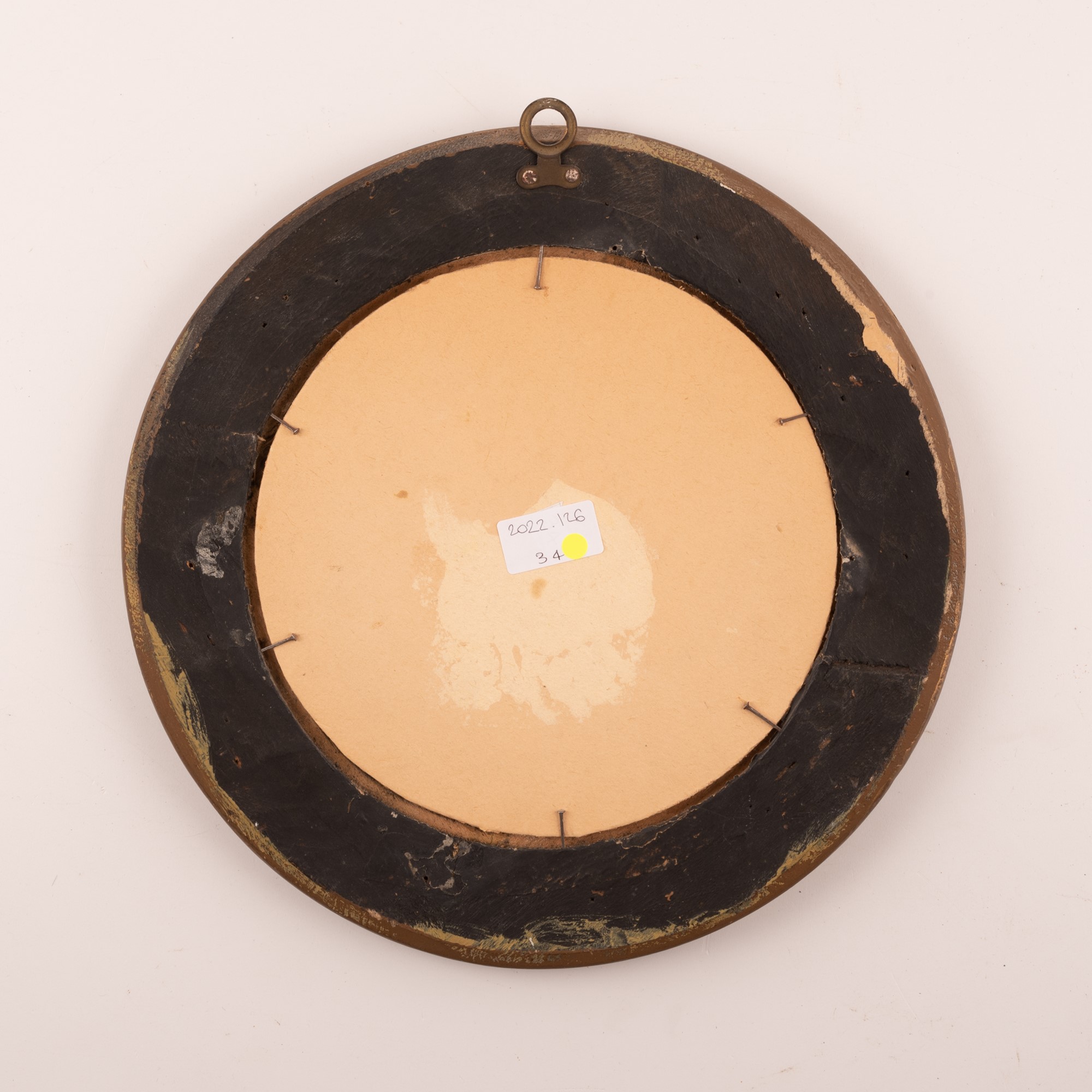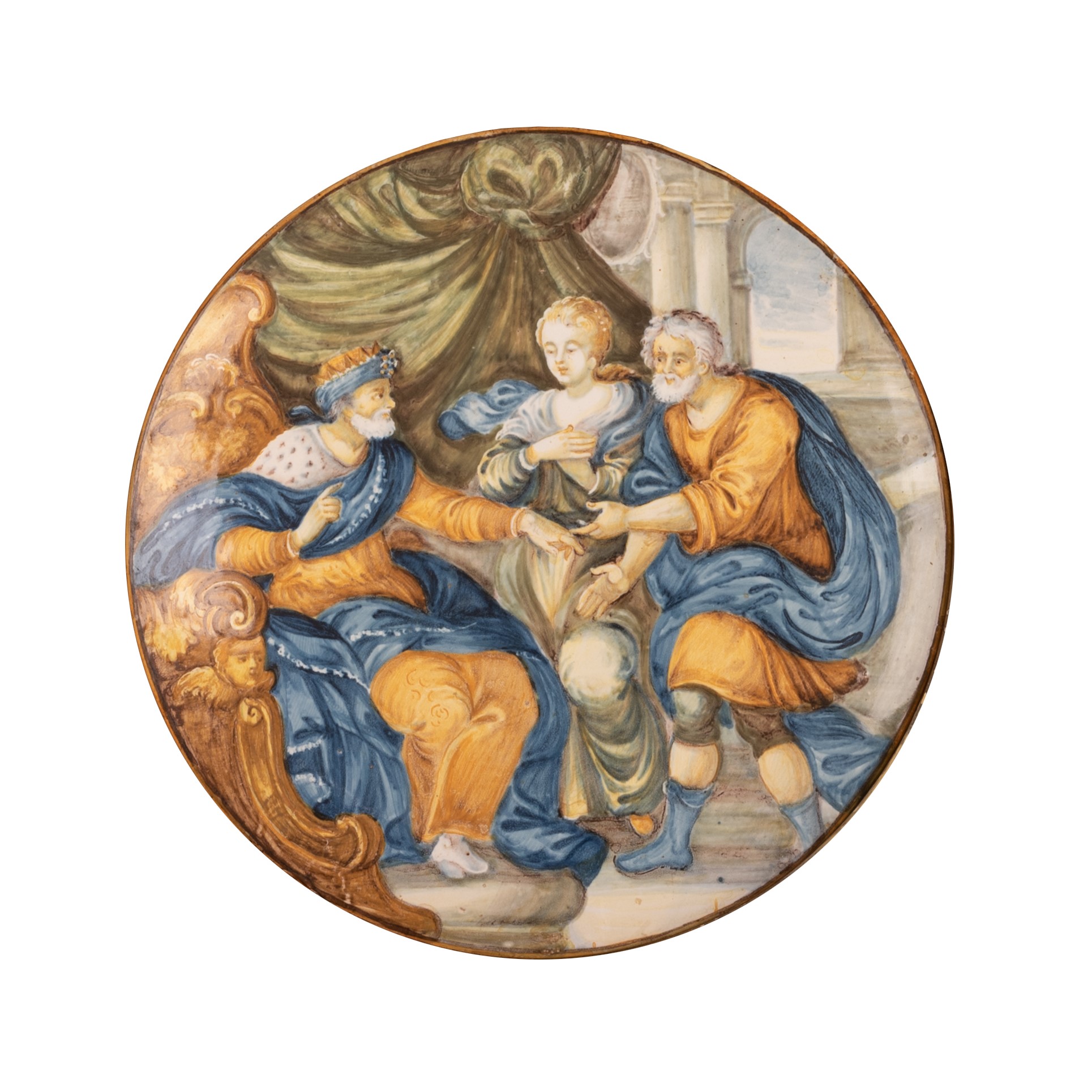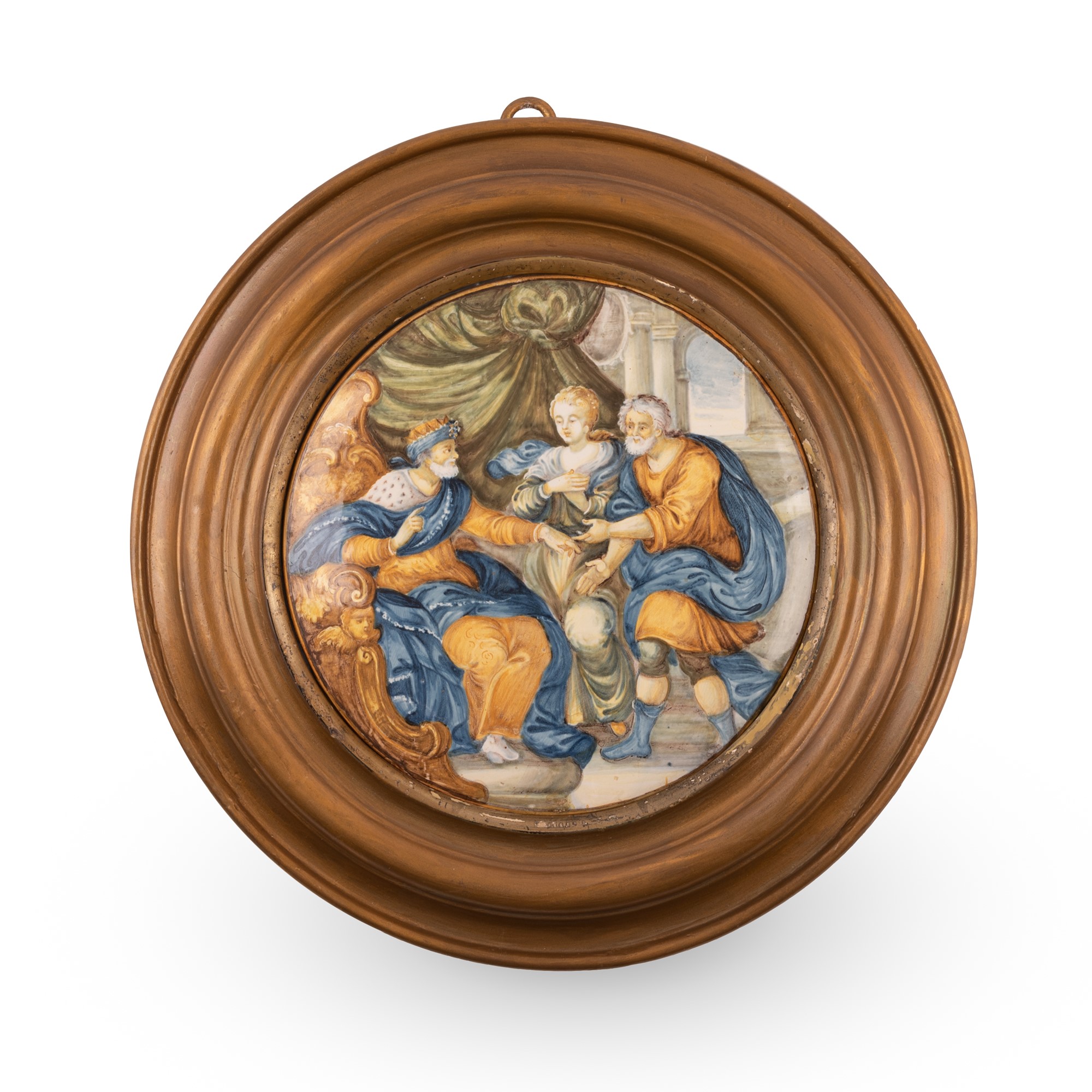 Tondo in maiolica decorato con una scena biblica. Ø cm 21