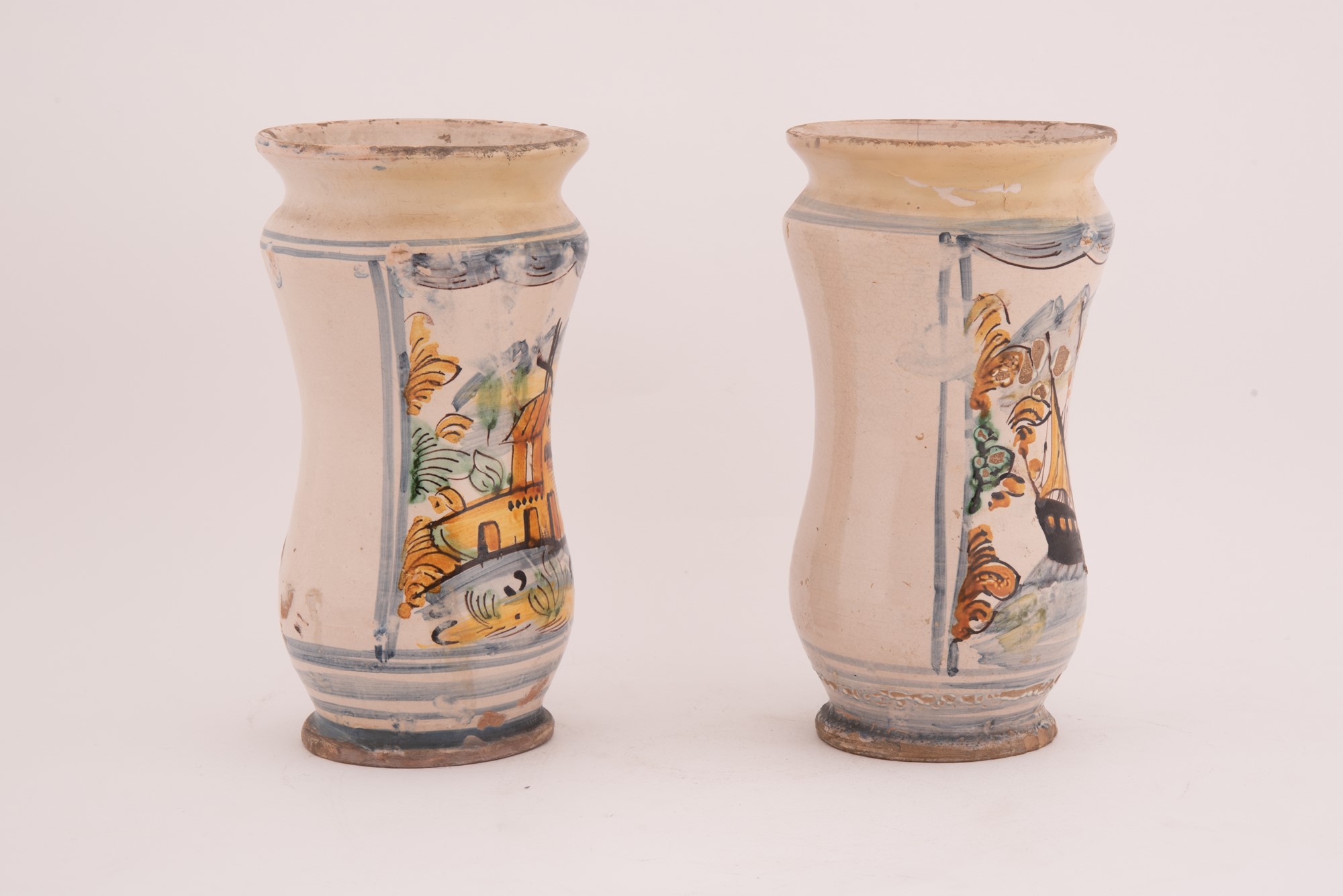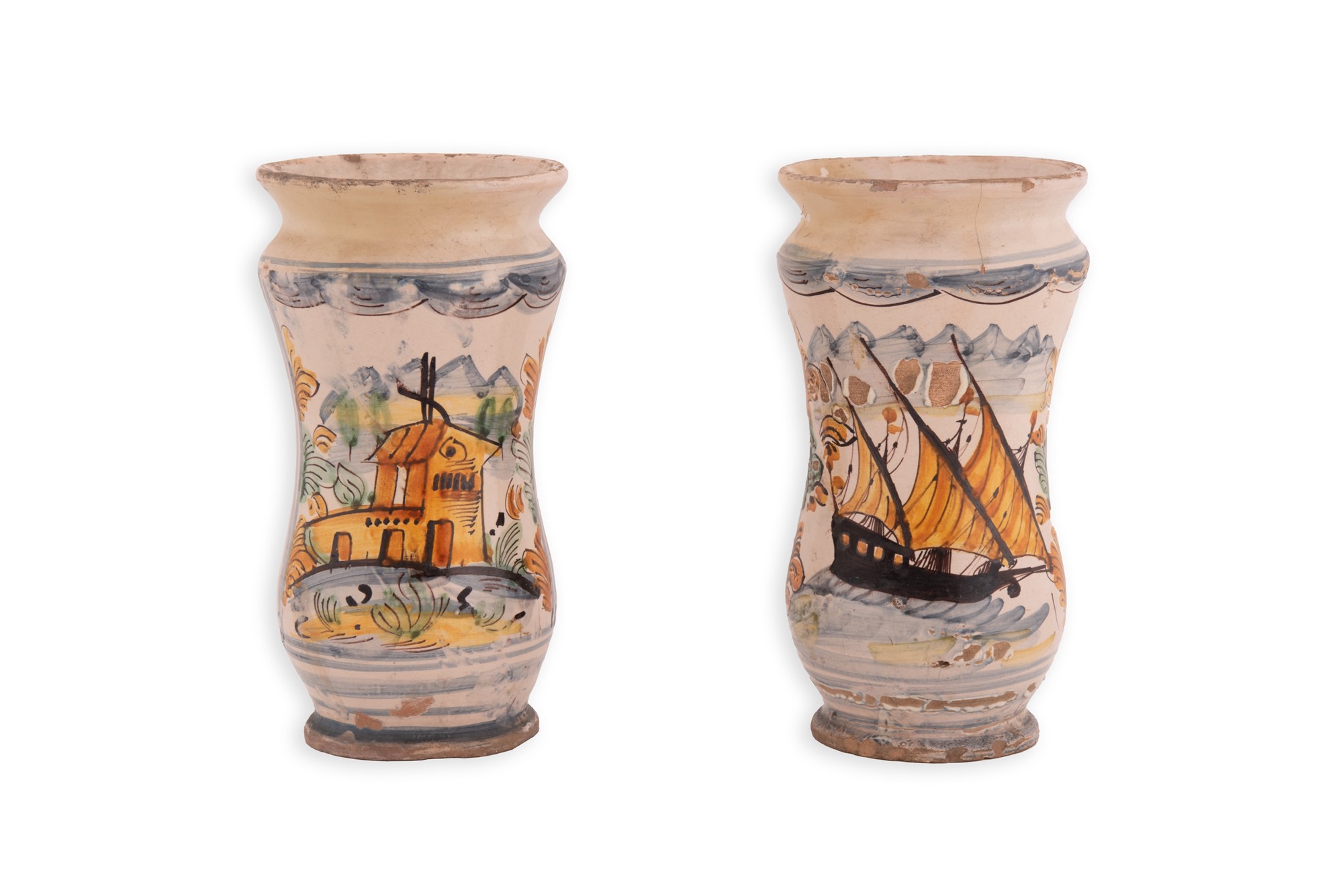 Coppia di Albarelli in maiolica decorati in policromia con vegetazione e paesaggi marini cm 24x12 XVIII secolo