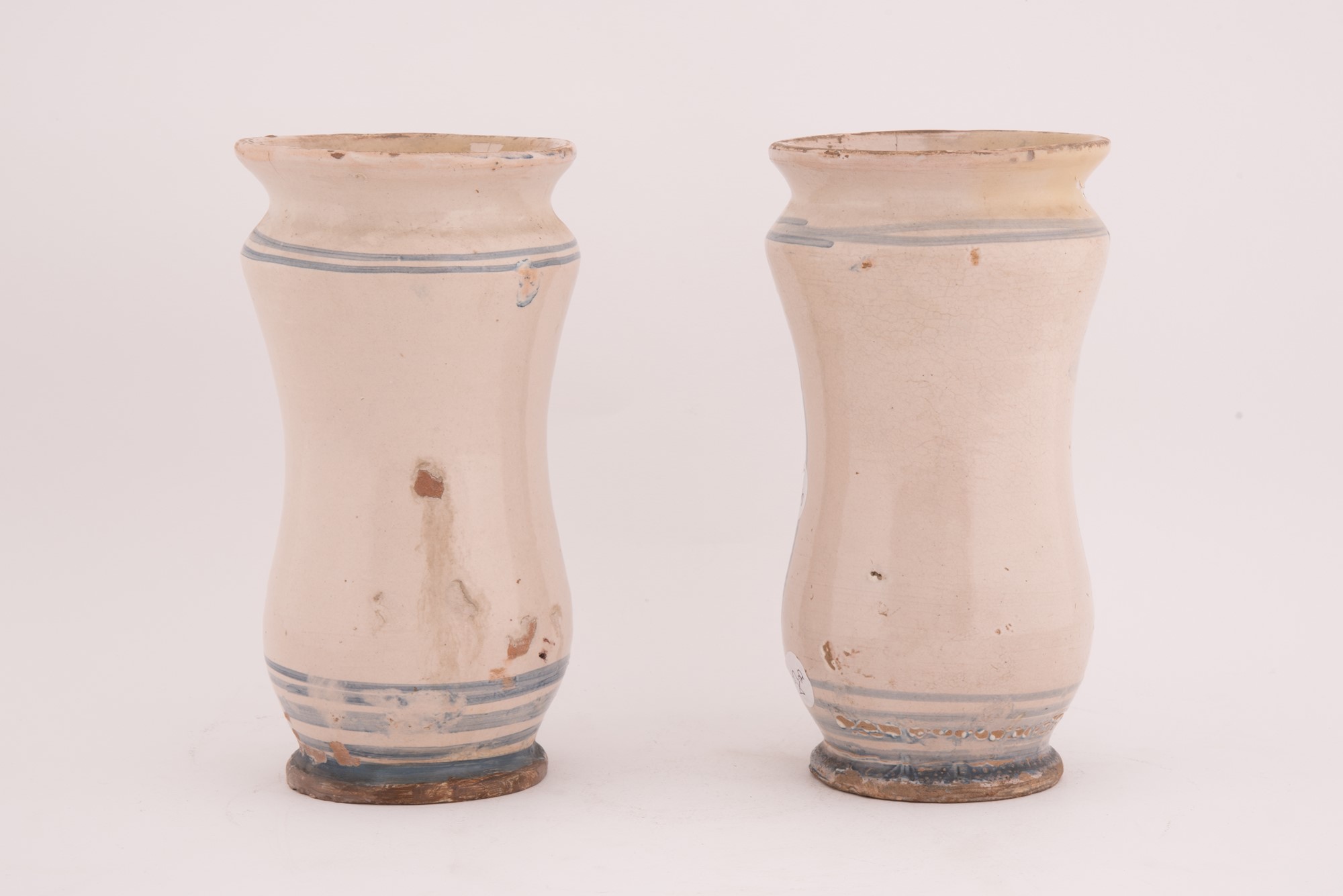 Manifattura dell'Italia meridionale ( - ) Coppia di Albarelli in maiolica decorati in policromia con vegetazione e paesaggi marini XVIII secolo cm 24x12