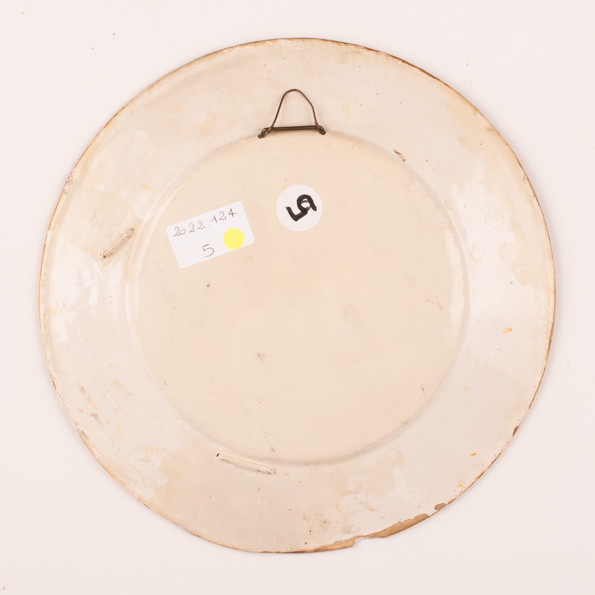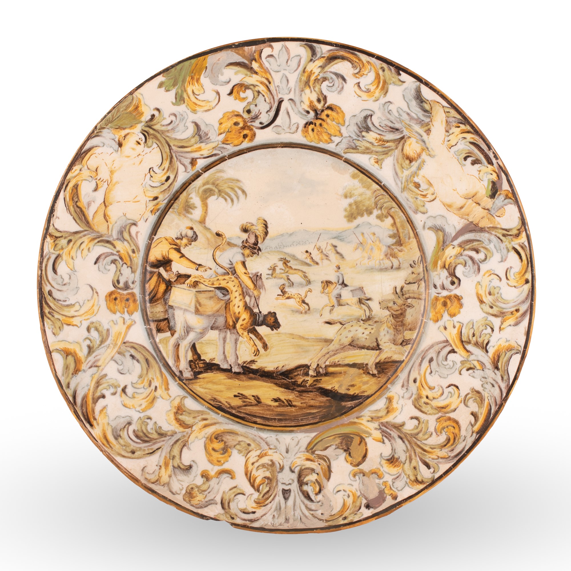 Carlo Antonio Grue (e bottega) (Castelli, 1655 - Castelli, 1723) Maiolica decorata in policromia. Nel cavetto è raffigurata una scena di caccia all'antilope con leopardo, con cacciatori a cavallo in un paesaggio africano. Ø cm 25