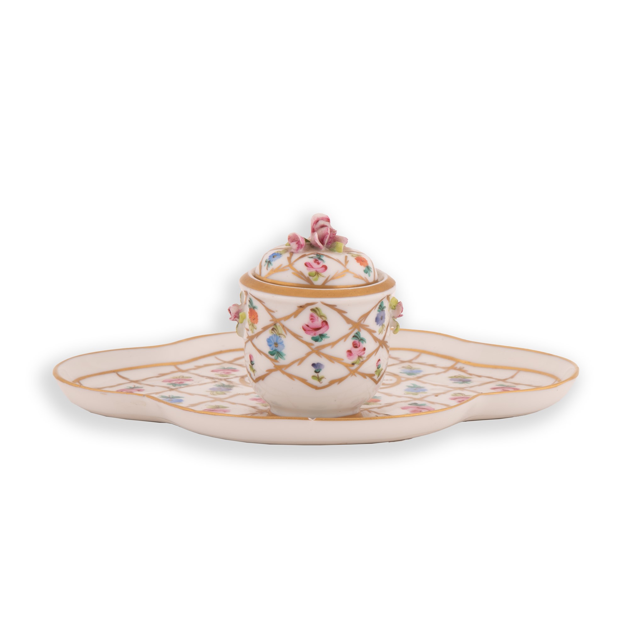Calamaio a fondo bianco decorato in policromia con motivi vegetali, romboidali in giallo oro contenenti mazzetti di fiori. Coperchio con presa a forma di rose. Bordatura mossa filettata in giallo oro. cm 8x20 Al centro decoro floreale inscritto in decoro floreale in giallo oro.