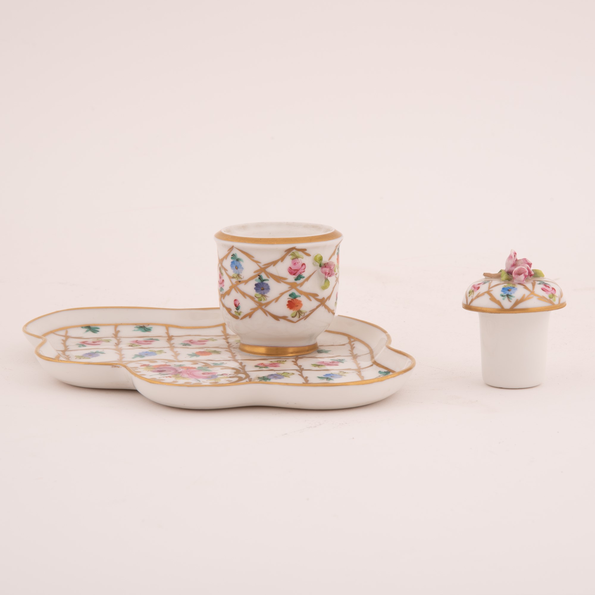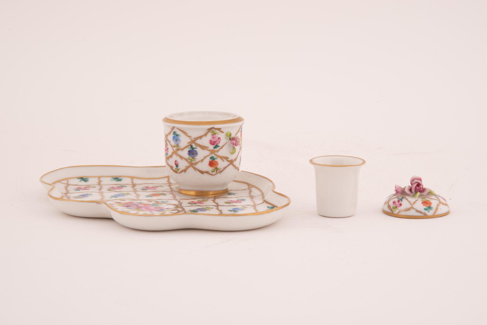Manifattura di Limonges, inizi XX secolo ( - ) Calamaio a fondo bianco decorato in policromia con motivi vegetali, romboidali in giallo oro contenenti mazzetti di fiori. Bordatura mossa filettata in giallo oro. cm 8x20