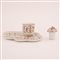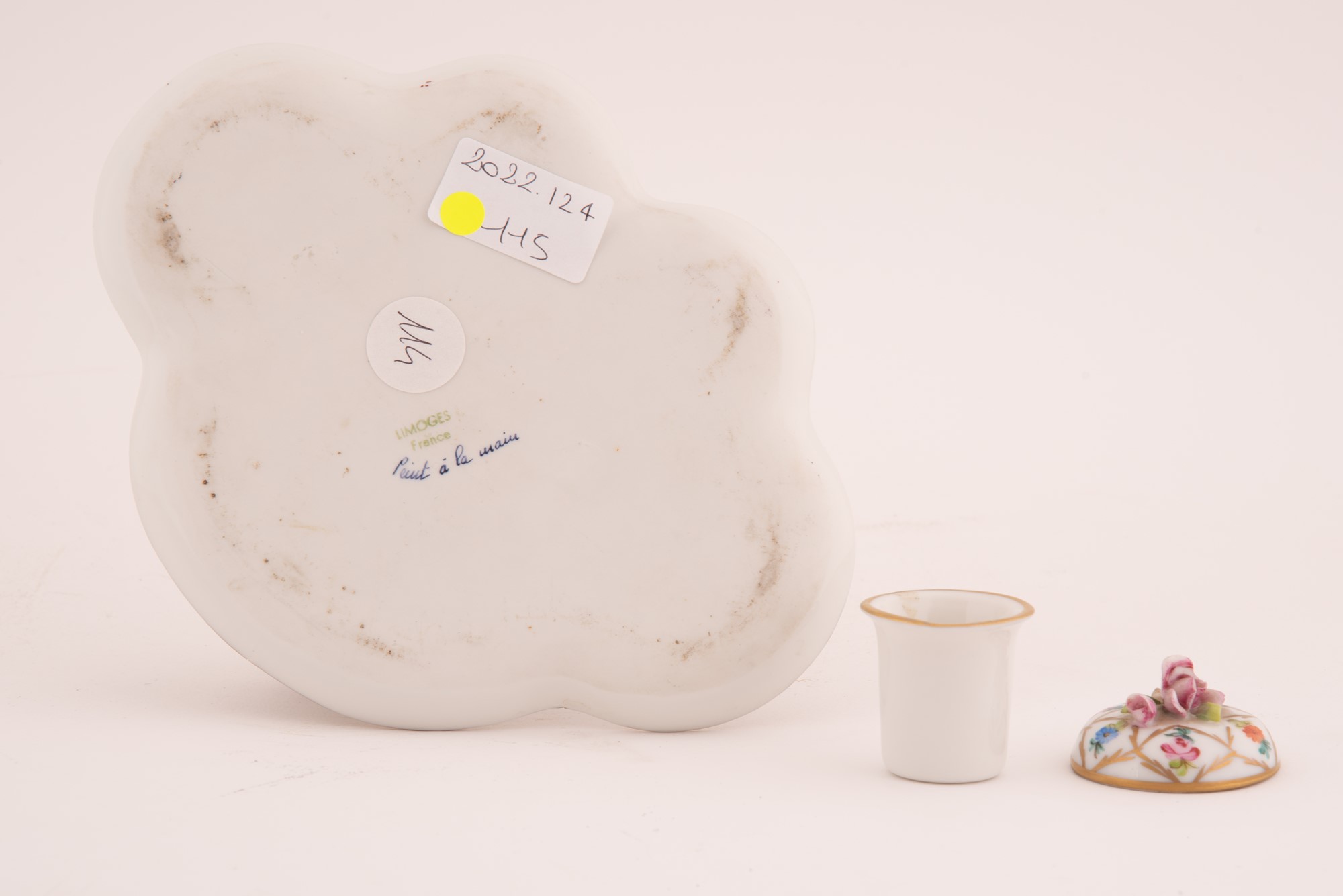 Lotto 198 | Manifattura di Limonges, inizi XX secolo ( - ) Calamaio a fondo bianco decorato in policromia con motivi vegetali, romboidali in giallo oro contenenti mazzetti di fiori. Bordatura mossa filettata in giallo oro. cm 8x20