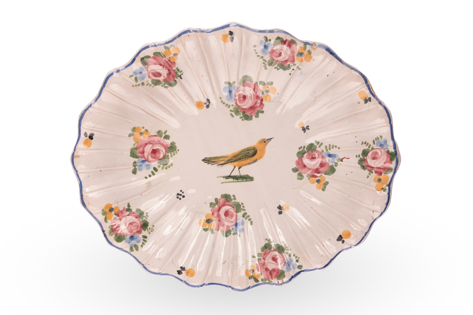 Manifattura castellana o abruzzese attiva nella prima metà del XIX secolo. ( - ) Vassoio in maiolica decorato mazzetti di fiori sparsi ed un uccellino cm 5x25,5x31