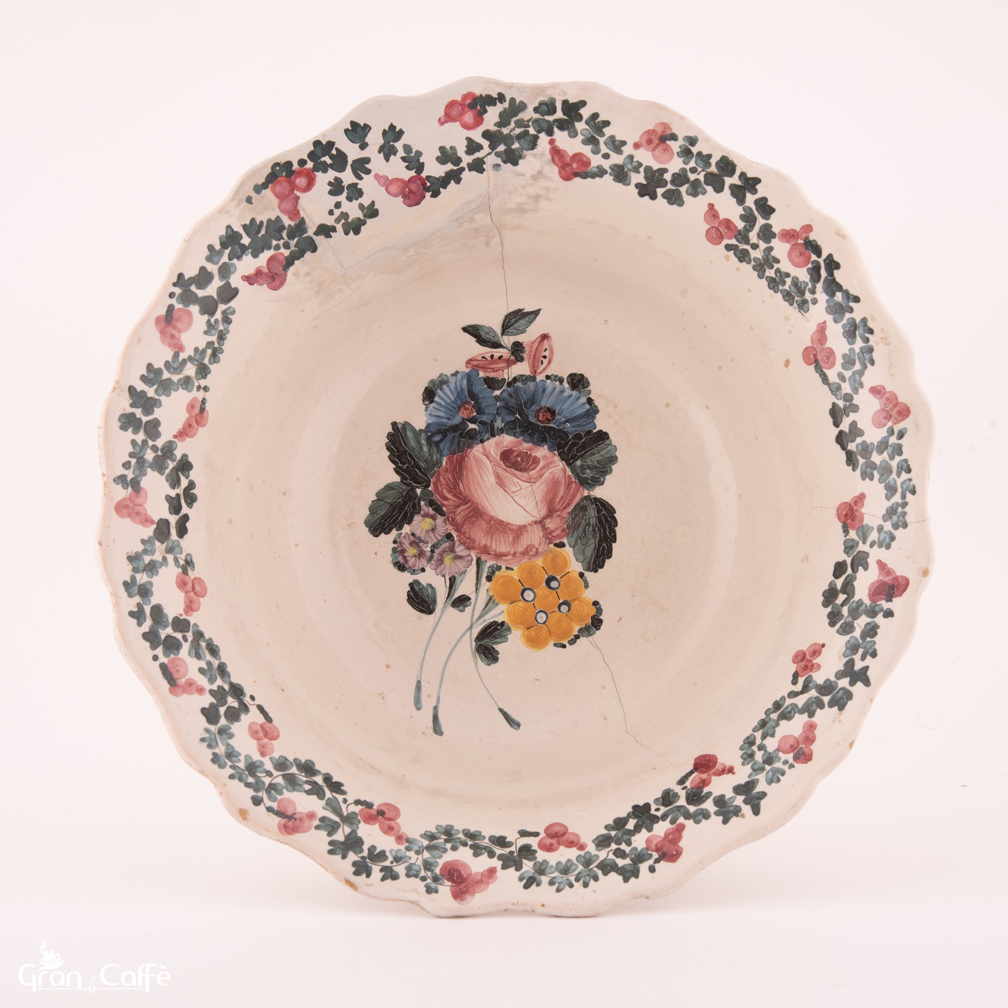 Grande piatto in maiolica decorato sulla tesa con ghirlanda e sul cavo con un mazzetto floreale Ø cm 32 Rotture e restauri