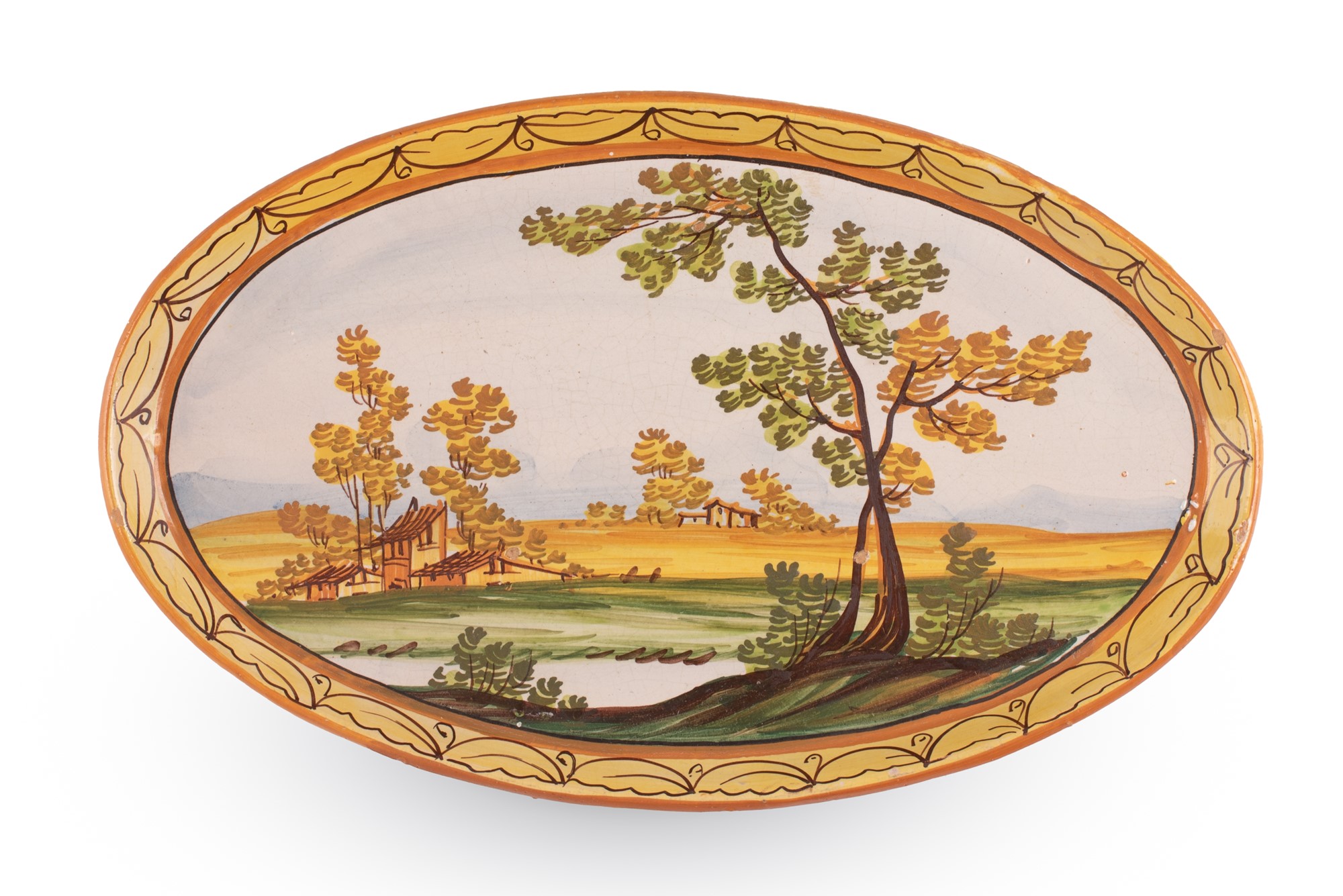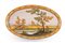 Piatto ovale decorato in policromia con paesaggio, lago e case. Bordo festonato in giallo. cm 20x33