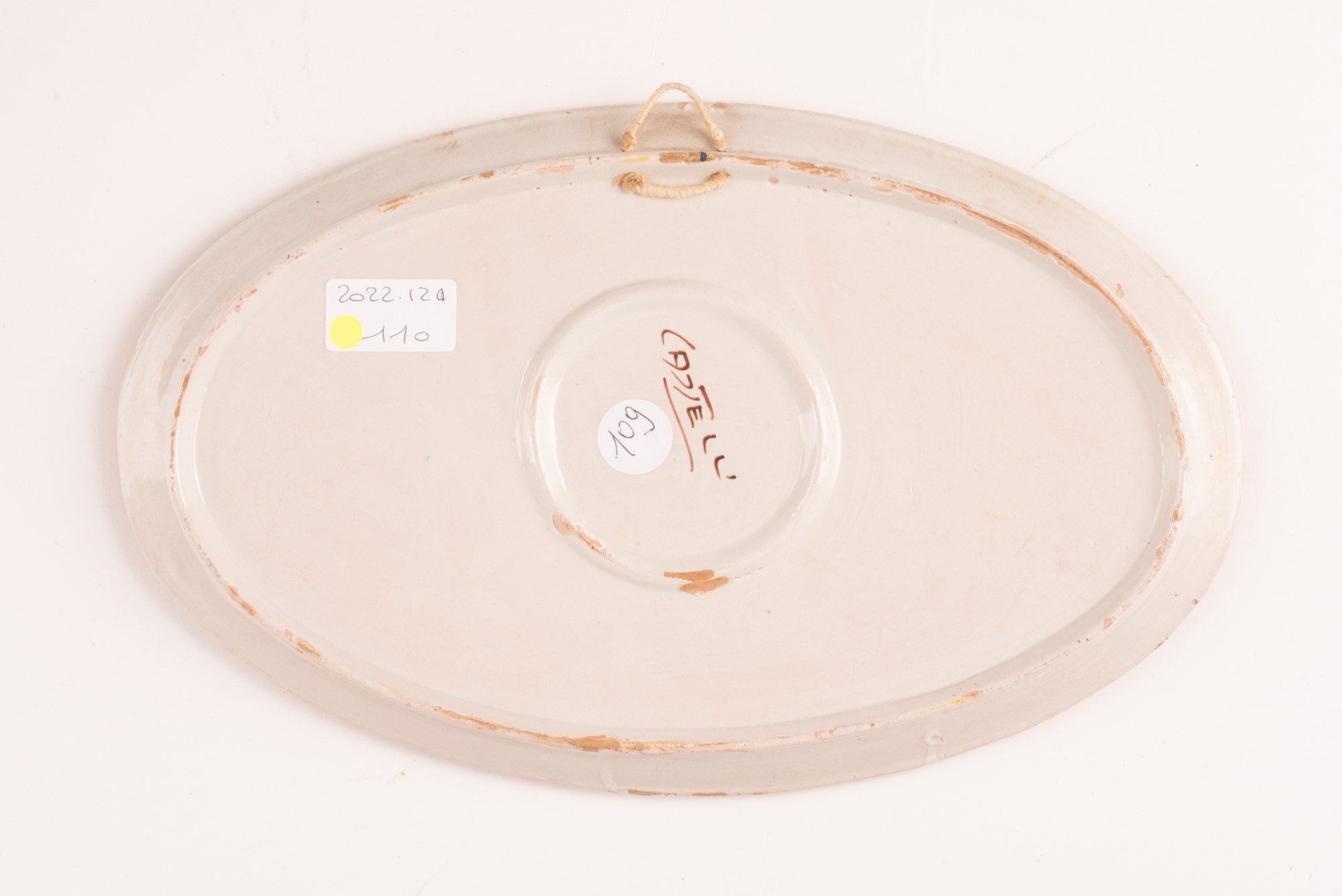 Manifattura castellana del XX secolo ( - ) Piatto ovale decorato in policromia con paesaggio, lago e case. Bordo festonato in giallo. cm 20x33