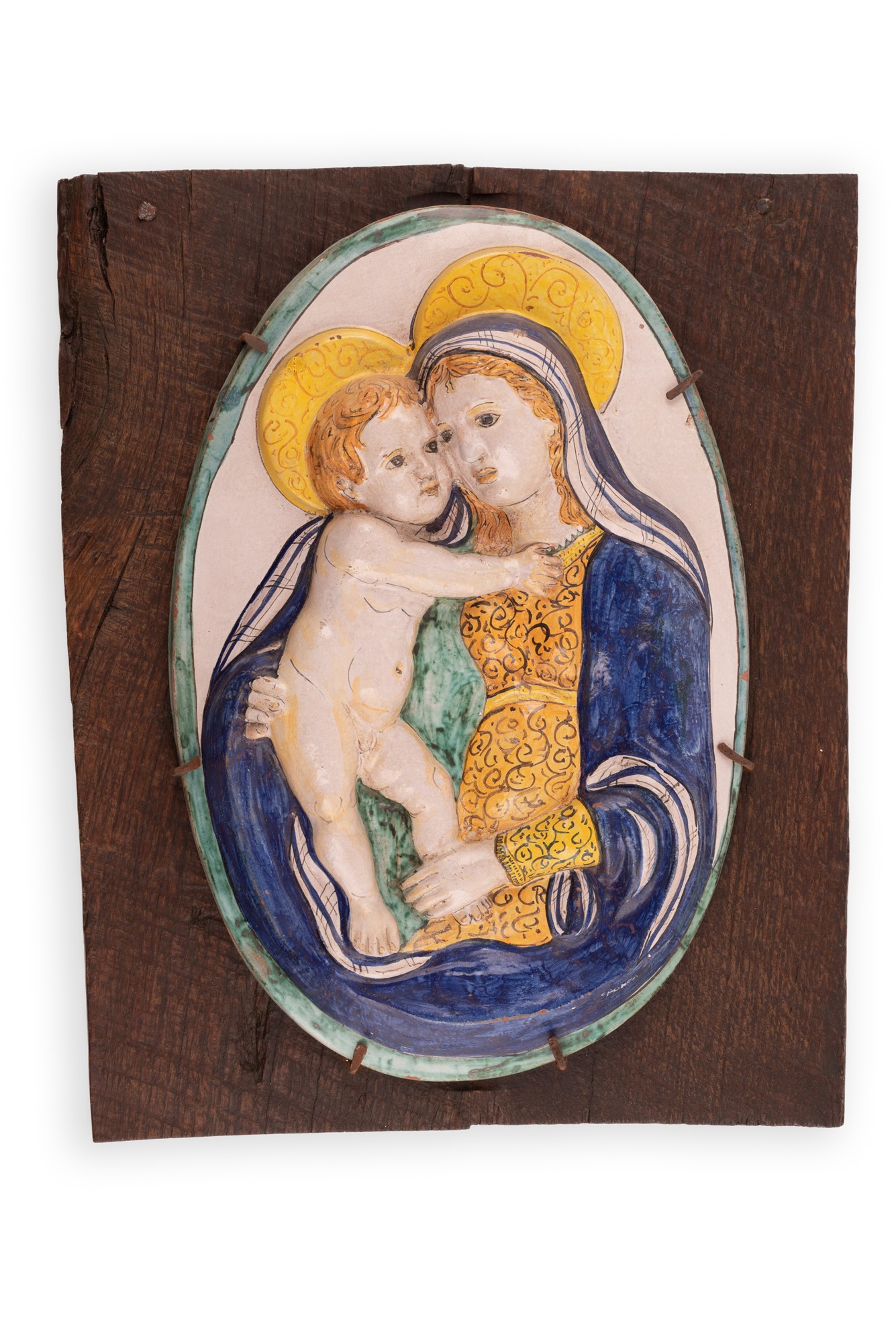 Bassorilievo ovale Madonna con Bambino su supporto ligneo cm 44x30 Bassorilievo in ovale, ceramica maiolicata policroma sufondo bianco e cornice lineare verde acqua. Eseguito ad imitazione delle manifatture "Della Robbia". Metà del XX secolo. L'opera è firmata in basso a destra "C. Monca" ed è grappata ad uno spesso legno di quercia
