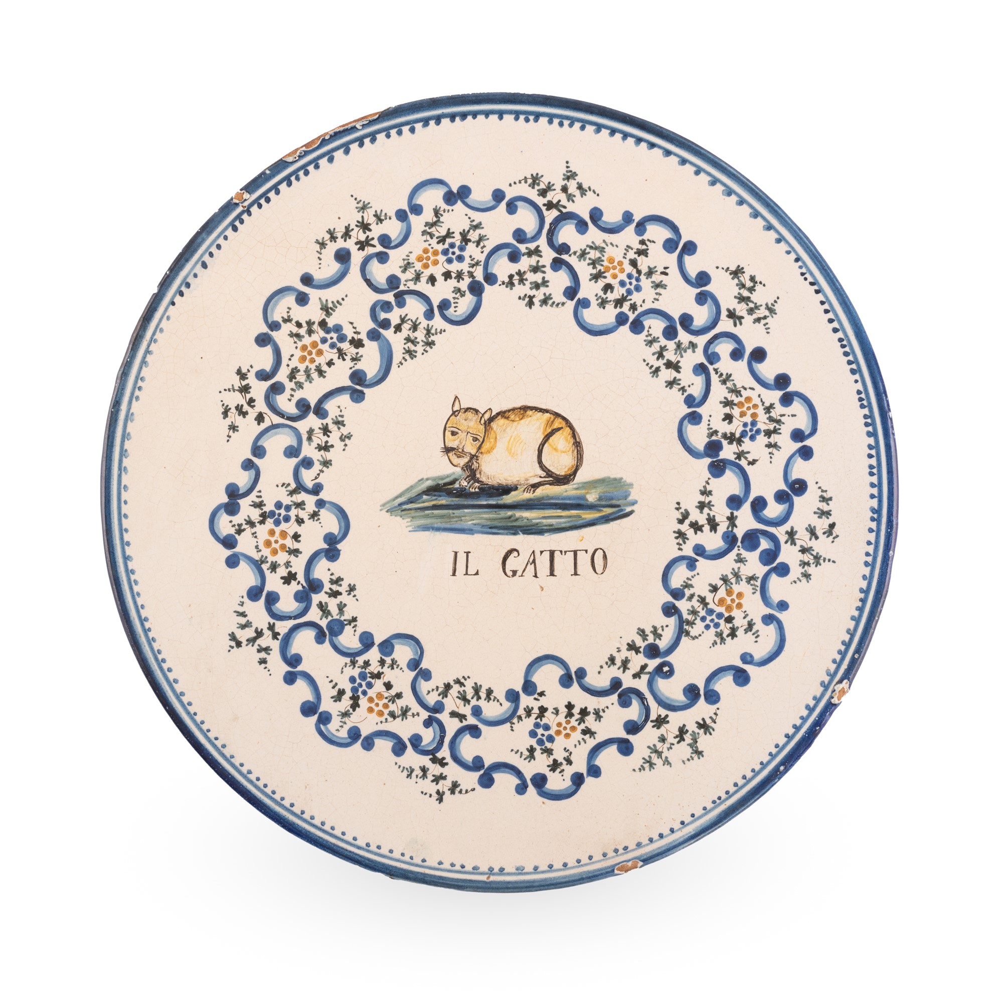 Tagliere in maiolica decorato con la figura di un gatto racchiusa in una riserva circolare, composto da elementi floreali e volute Ø cm 35,5