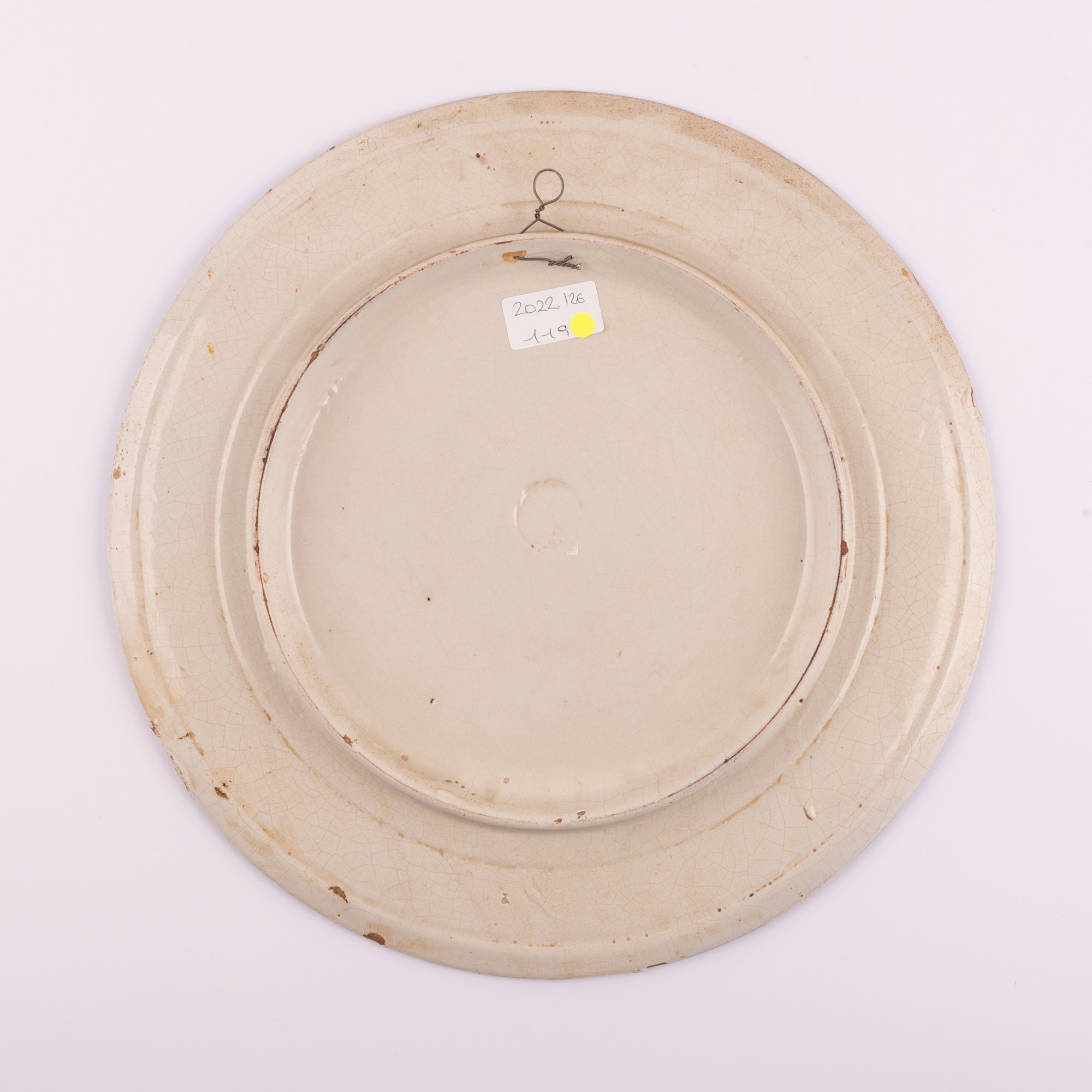 Manifattura abruzzese attiva tra il tardo XIX ed i primi del XX secolo. ( - ) Tagliere in maiolica decorato con la figura di un gatto racchiusa in una riserva circolare, composto da elementi floreali e volute Ø cm 35,5