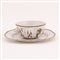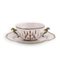 Tazza da puerpera in maiolica a doppio manico decorata in policromia a motivi geometrici. Si accompagna ad un piattino dal bordo mistilineo similmente decorato. piatto Ø cm 22,5; tazza Ø cm 13 Mancante del coperchio.