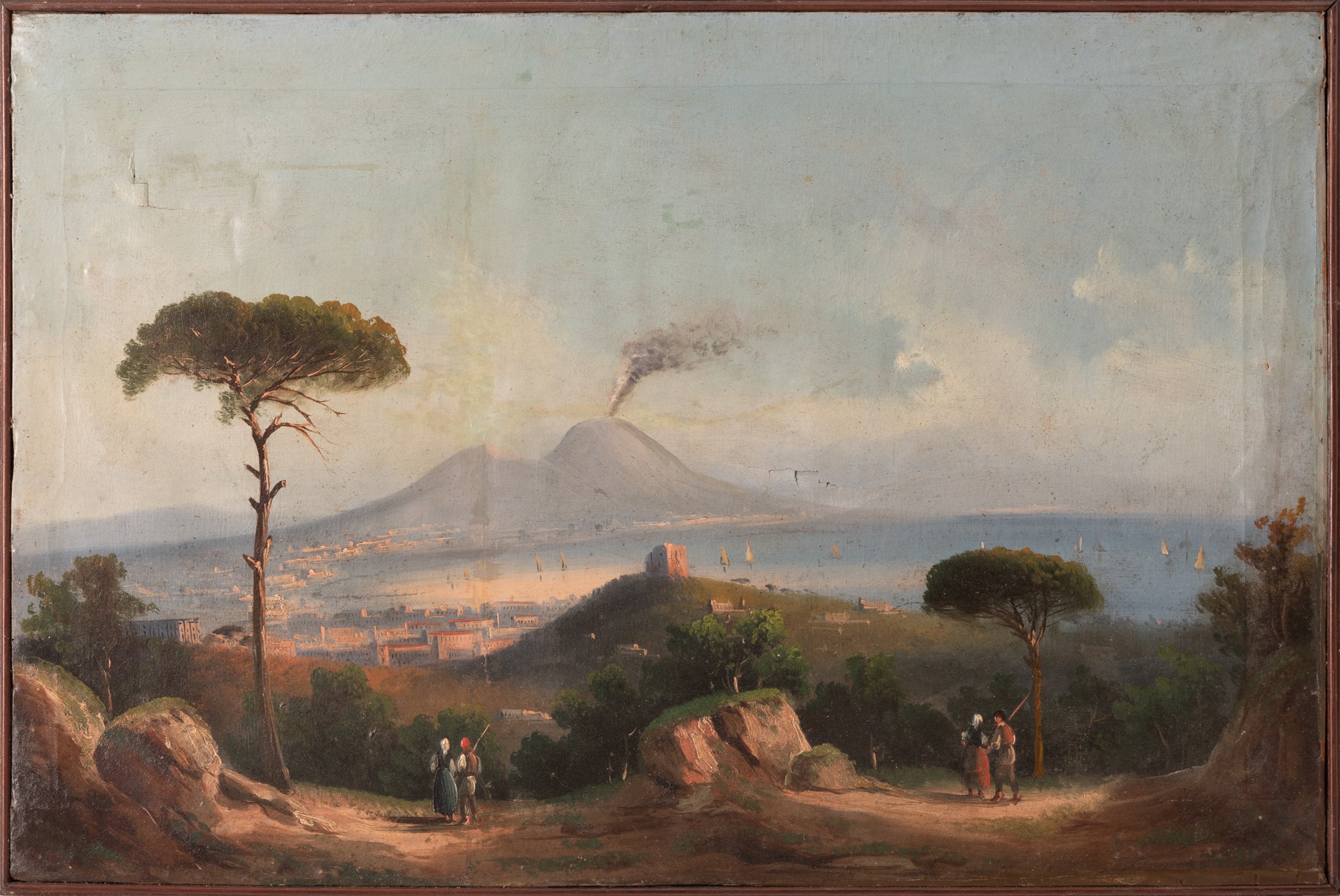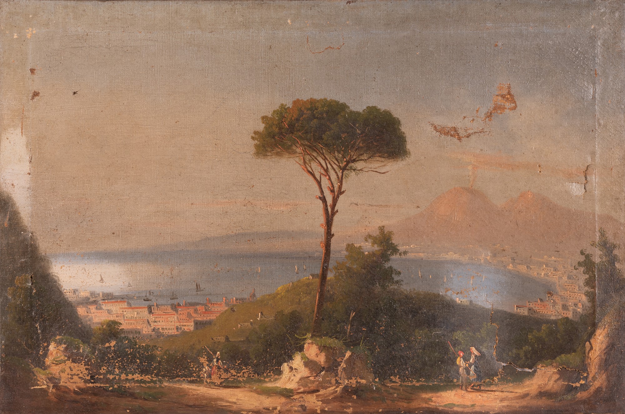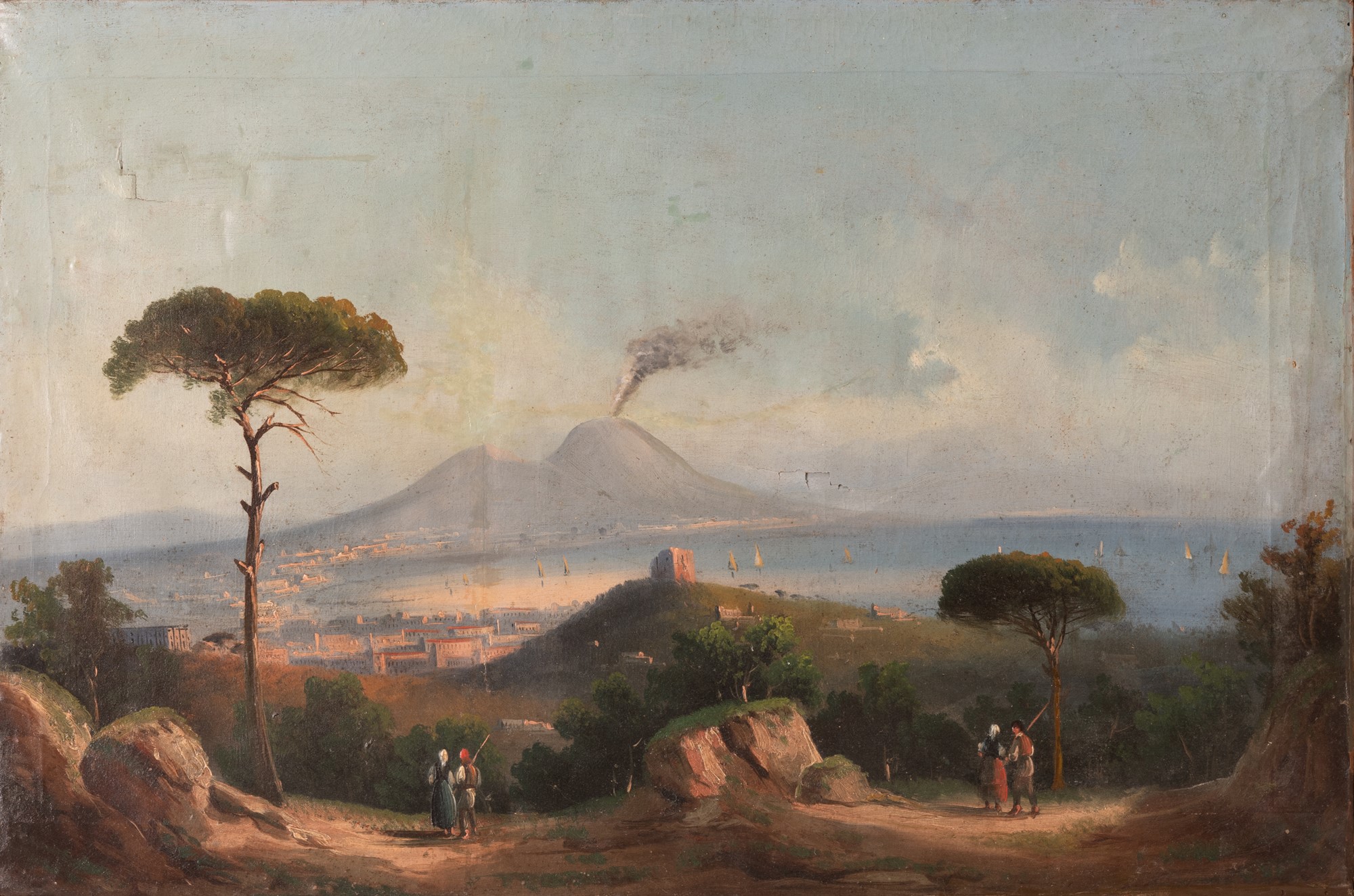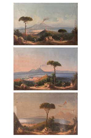 Scuola napoletana del XIX secolo ( - ) Lotto di tre vedute del golfo di Napoli con Vesuvio Olio su tela cm 50x76;